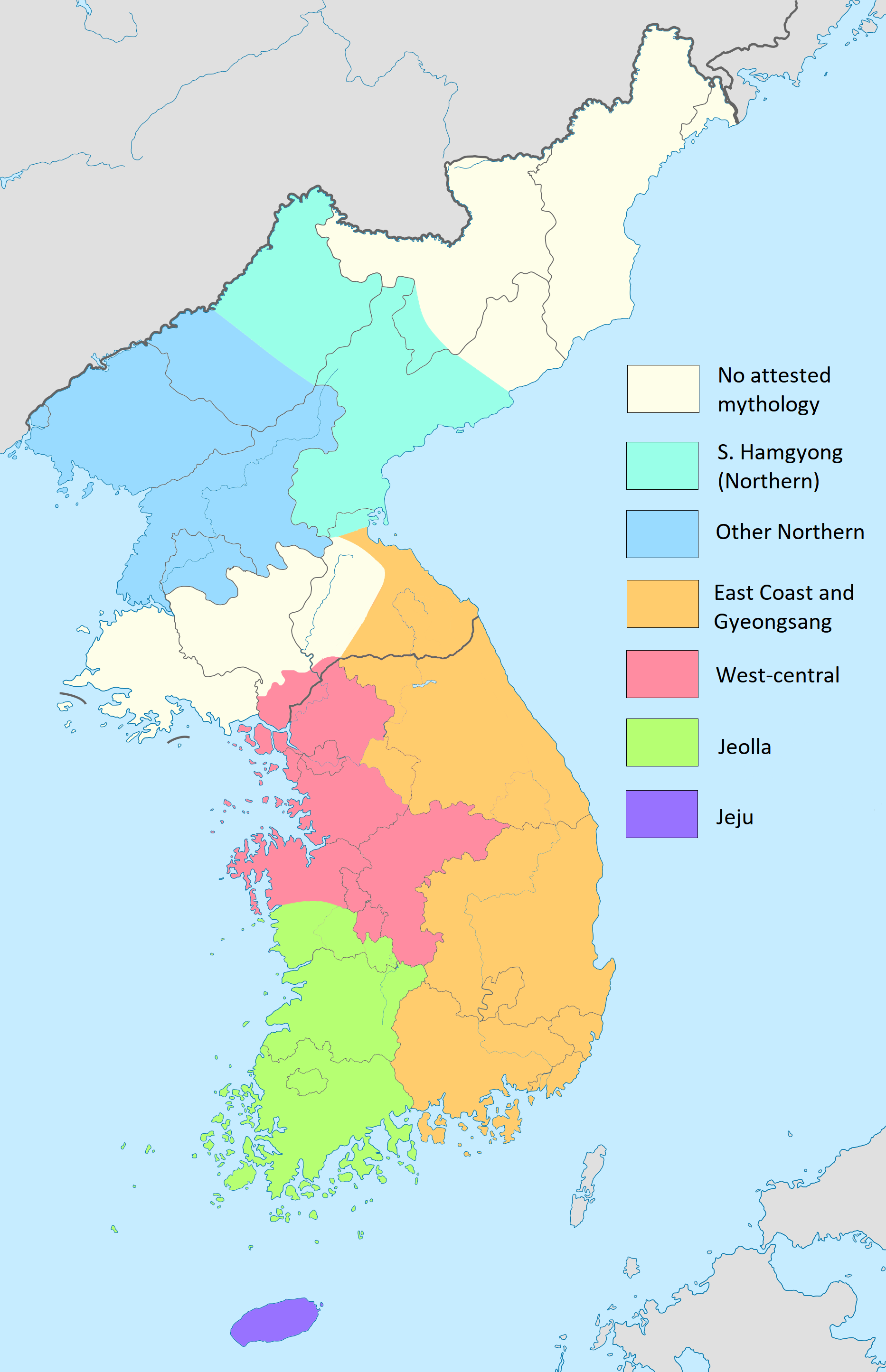 무가권(巫歌圈)으로 불리는 한국의 샤머니즘 신화는 크게 다섯 개의 지역적 전통으로 나뉜다. 이는 한반도 전역에서 발견되는 『제석본풀이』와 『바리공주』 두 서사시의 주요 변이를 나타낸다.[3] 다섯 지역 각각은 다른 지역에서는 발견되지 않는 신화들을 가지고 있으며, 서사의 실제 공연에서도 독특한 경향을 보인다. 특히 남쪽 제주도의 신화 전통은 다른 지역과 매우 다르다.[4]