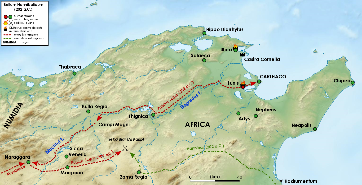 기원전 204년 스키피오의 아프리카 침략으로 기원전 203년 한니발은 본국으로 귀환, 스키피오에게 카르타고 식민지 양도를 제안했지만, 스키피오는 카르타고의 항복을 요구하며 협상은 결렬되었다.[139]