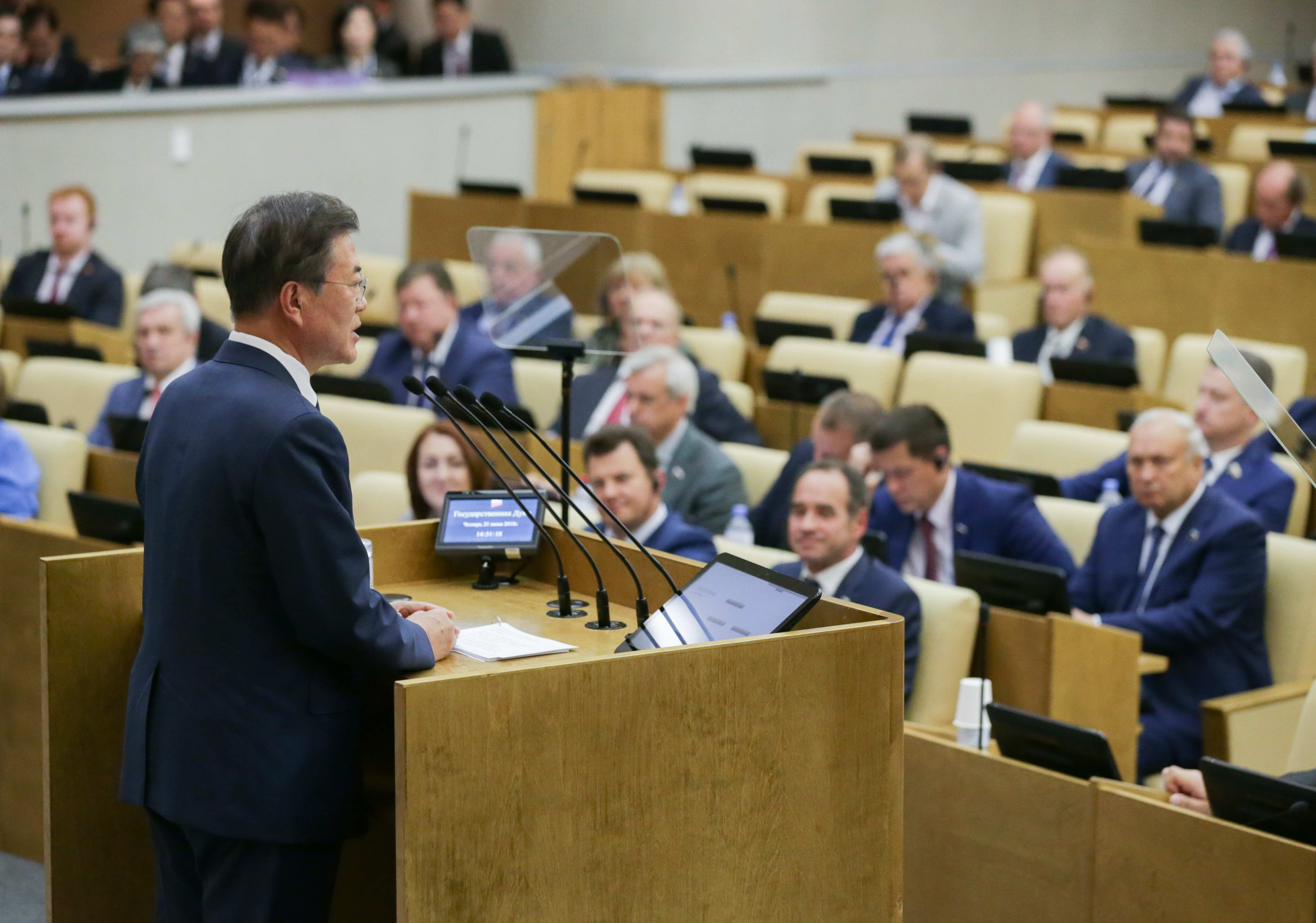문재인 대통령은 2018년 러시아를 국빈 방문하여 국가 두마에서 연설했는데, 이는 러시아 의회에서 연설한 최초의 대한민국 지도자였다.[11] 블라디미르 푸틴 대통령과 회담을 갖고 자유 무역 지역 설립을 위한 문건에 서명했다.[12]