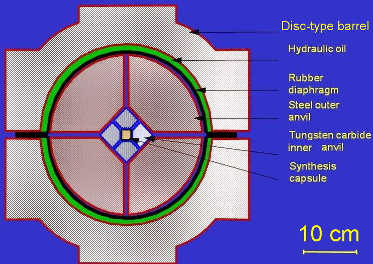 분할구 장치(BARS 장치)는 벨트형과 큐빅형보다 가장 작고 효율적이며, 경제적으로도 다이아몬드 합성이 가능하다. 약 2cm3의 세라믹 원통형 용기가 중앙에 배치되며, 이 합성 용기는 활석 등 정육면체 압력 전달 물질 속에 넣고, 탄화 텅스텐 등 초경합금 내부 앤빌과 8개의 강철 외부 앤빌로 가압한다.[181] 지름 1m 챔버에 고정 후 기름을 채우고, 반응 용기에 열과 압력을 동시에 가한다. 동축 그라파이트 가열 장치로 합성 용기를 가열하고, 열전대로 온도를 측정한다.[182]