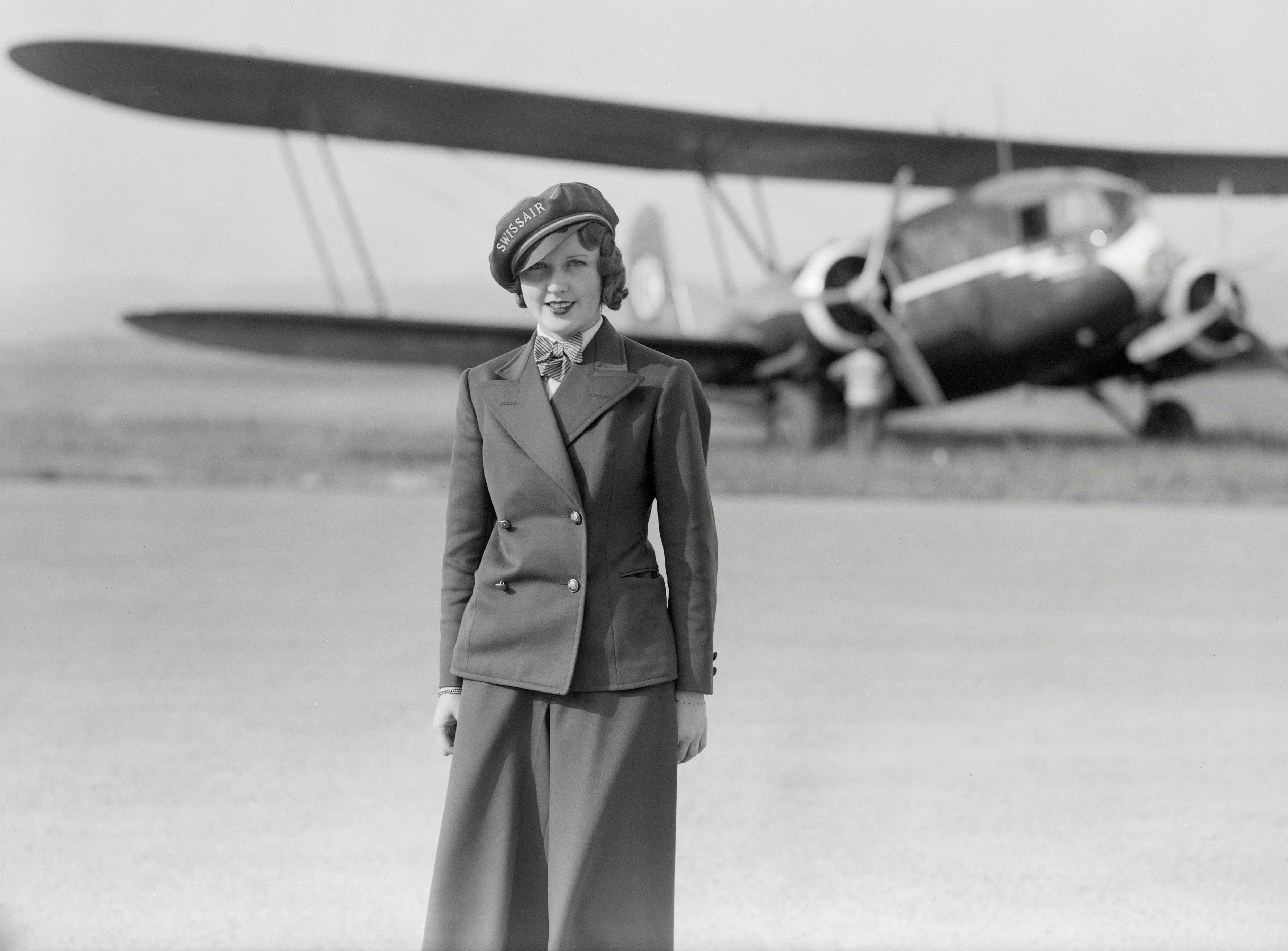 넬리 디너, 1934년 5월에 고용된 유럽 최초의 여성 항공 승무원. 그녀는 뒤에 보이는 비행기에서 사망했으며, 1934년 스위스 항공 투틀링겐 사고에서 사망했다.