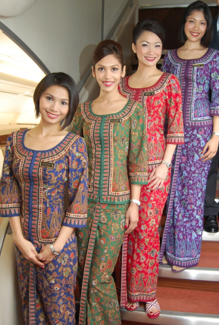 1980년대 이후, 특히 국가 국책 항공사(flag carrier)를 중심으로 아시아 항공사들은 여성 항공 승무원 유니폼에 자국 고유의 민속 의상(Folk costume)과 직물을 사용했다. 이는 자국의 문화를 선보이는 동시에 따뜻함과 환대를 전달하기 위한 마케팅 전략이었다. 예를 들어, 타이 항공(Thai Airways International)의 항공 승무원들은 승객 탑승 전에 회사에서 제공하는 보라색 정장에서 전통적인 태국 의상으로 갈아입어야 한다.[44] 가루다 인도네시아(Garuda Indonesia), 말레이시아 항공(Malaysia Airlines) 및 싱가포르 항공(Singapore Airlines)의 여성 항공 승무원들은 바틱(batik) 무늬가 들어간 개량된 케바야(kebaya)를 착용한다. 가루다 인도네시아의 'Lereng Garuda Indonesia'라는 디자인은 'Parang Gondosuli'라는 전통적인 바틱(batik) 모티프에서 영감을 받았다.[45] 베트남 항공(Vietnam Airlines) 항공 승무원은 빨간색 아오자이(áo dài)를 입고, 에어 인디아(Air India) 항공 승무원은 모든 여객 항공편에서 사리(sari)를 착용한다.