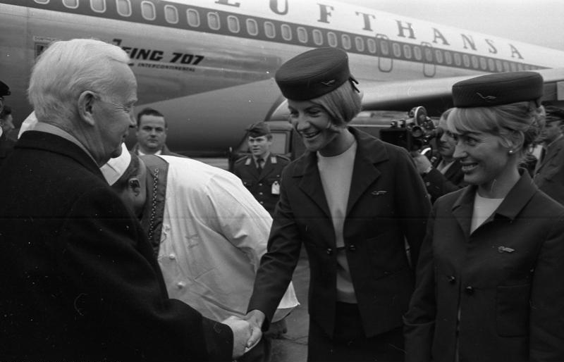 1960년대 루프트한자 항공(Lufthansa)의 객실 승무원 (뒤는 보잉 707기)
