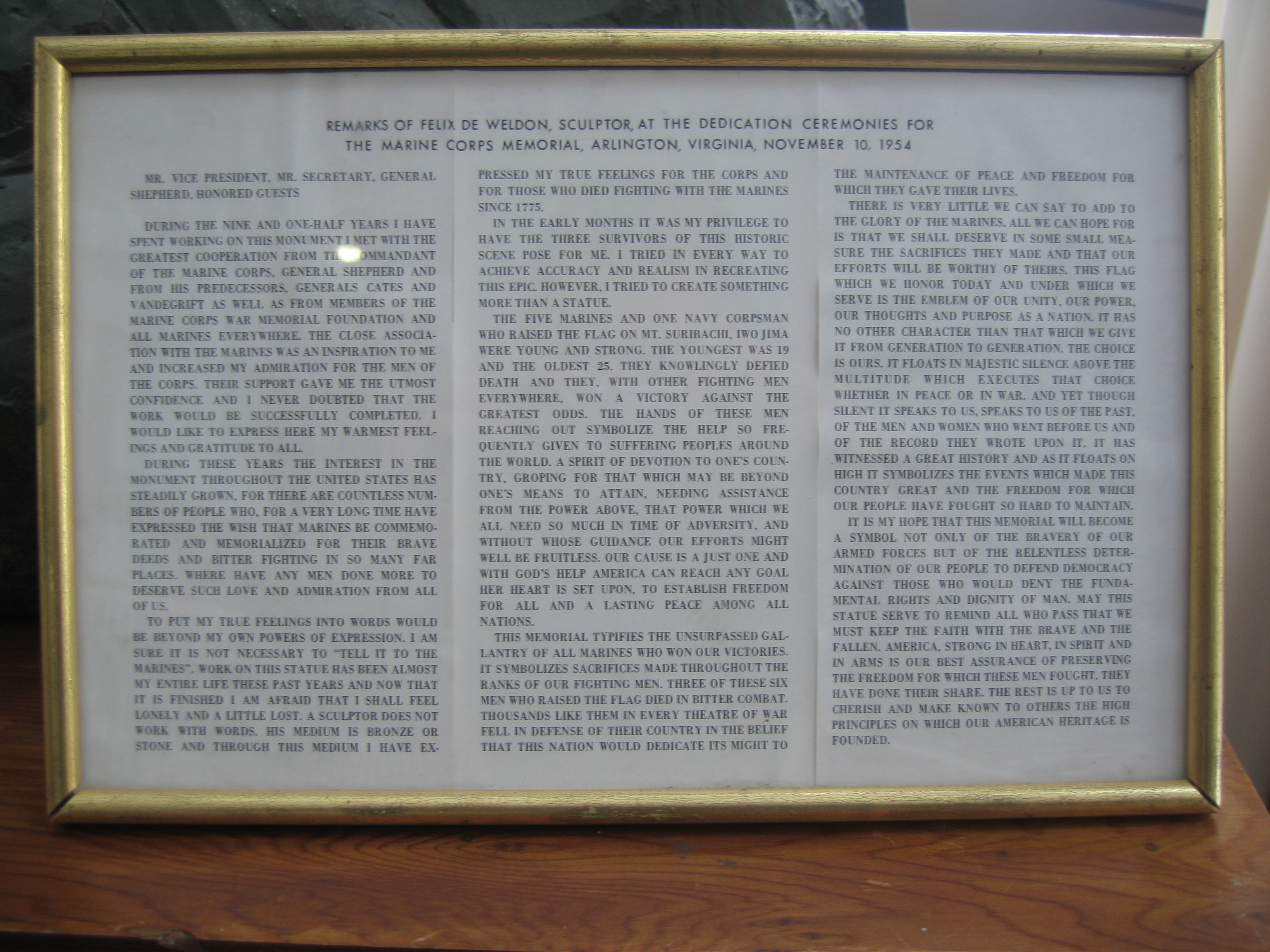 기념비는 해병대 창설 179주년 기념일인 1954년 11월 10일 수요일에 공식적으로 헌정되었다.[1] 헌정식에는 드와이트 D. 아이젠하워 대통령, 리처드 닉슨 부통령, 찰스 에르윈 윌슨 국방부 장관, 로버트 앤더슨 국방부 차관, 오르메 루이스 내무부 차관보, 레뮤엘 C. 셰퍼드 주니어 해병대 사령관 등 주요 인사들이 대거 참석했다. 로버트 앤더슨 국방부 차관이 사회를 맡았으며, 군목들의 기도에 이어 해병대 전쟁 기념 재단 회장인 J.W. 모로 대령, 오르메 루이스 내무부 차관보, 레뮤엘 셰퍼드 장군의 연설이 있었다. 셰퍼드 장군은 연설을 통해 기념비를 미국 국민에게 헌정한다고 선언했다. 이후 기념비의 깃대에 미국 국기가 게양되었고, 조각가 펠릭스 드 웰던도 연설했으며 리처드 닉슨 부통령이 헌정사를 낭독했다.[6] 행사는 나팔 연주로 엄숙하게 마무리되었다.