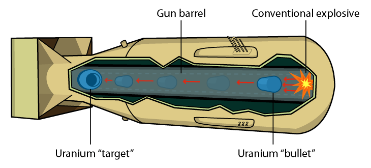 초임계 질량을 만드는 가장 쉬운 방법은 핵분열성 물질을 두 부분으로 나누어, 하나를 다른 하나에 총처럼 쏘는 것이다. 이 방식을 포신형(砲身型, gun type)이라고 하며, 히로시마에 투하된 리틀 보이가 이러한 방식이었다.[15]