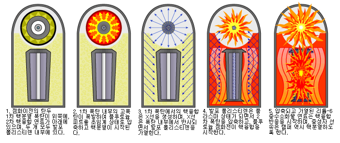 핵융합은 가벼운 원자를 결합하여 무거운 원자를 형성하는 반응이다. 두 반응 모두 비슷한 화학 반응보다 약 백만 배 더 많은 에너지를 생성한다.[4]무기에서 가장 중요한 핵융합 반응은 D-T 반응이라고 한다. 핵분열의 열과 압력을 이용하여 중수소(2D영어) 또는 수소-2가 삼중수소(3T영어) 또는 수소-3와 융합하여 헬륨-4(4He영어)와 중성자(n) 하나, 그리고 에너지를 생성한다.