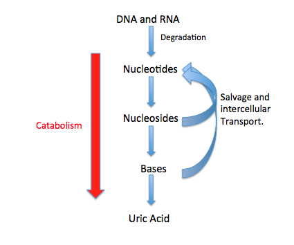 뉴클레오타이드 분해 | 뉴클레오타이드는 먼저 뉴클레오사이드 형태로 전환된 다음, 질소 염기와 오탄당으로 더 분해된다. 질소 염기의 분해는 퓨린과 피리미딘에 따라 다른 경로를 따른다. |