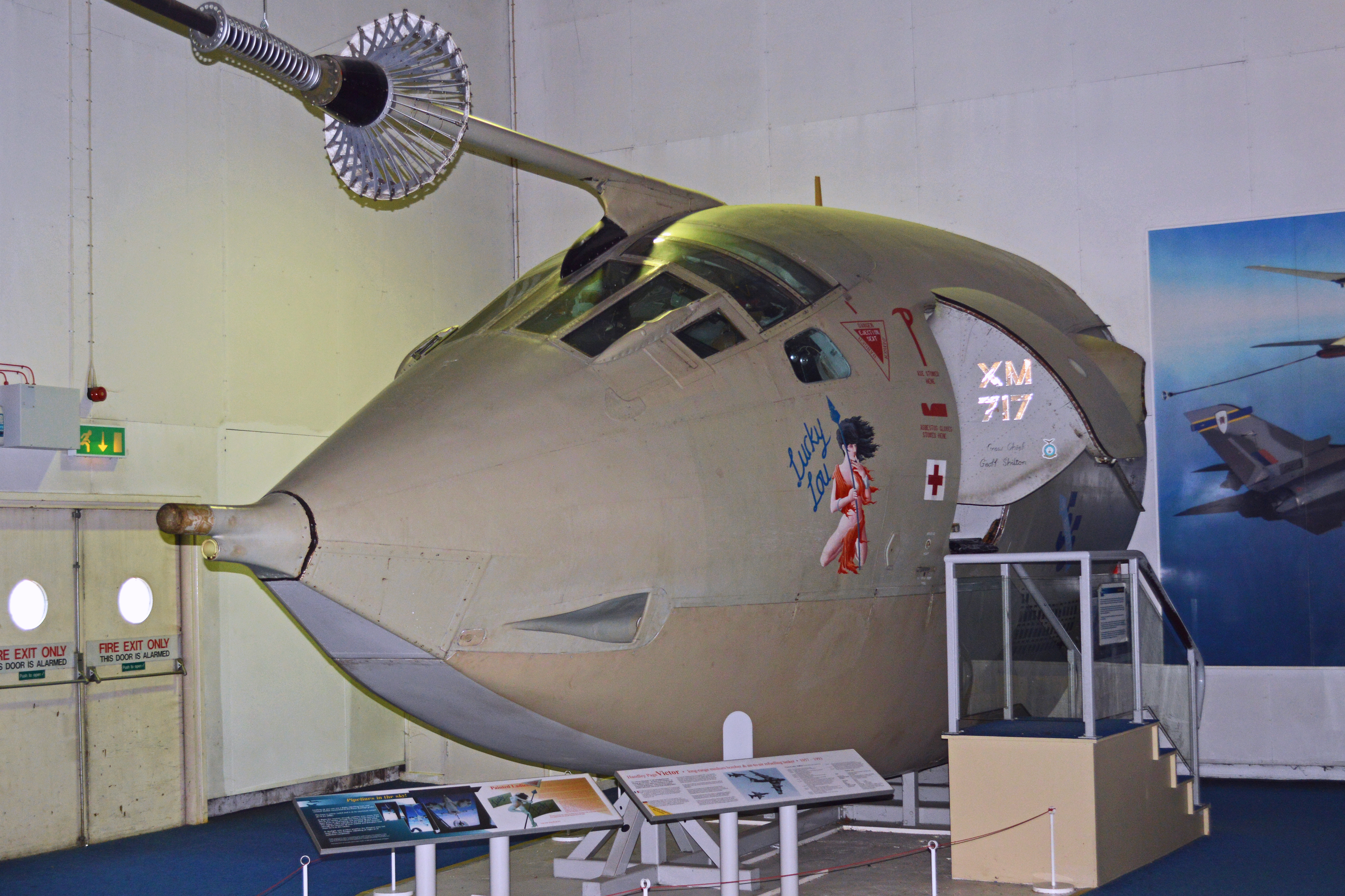 기수 부분은 폭이 넓고 가압 구획이 커서, 벌컨 폭격기와 달리 모든 승무원이 같은 층에 배치될 수 있었다.[159] 조종석에는 정조종사와 부조종사만이 앞을 보고 앉았으며, 이들의 좌석에는 사출 좌석이 설치되어 있었다.[159] 다른 승무원인 항법사, 항공 기관사, 그리고 항공 전자 장교(AEO)는 조종사 뒤쪽에 뒤를 보고 앉았다.[159] 항공 전자 장교(AEO)는 항공기의 광범위한 전자전(ECM) 장비 운영과 전자 및 통신 시스템에 대한 주요 책임을 맡았다.[66]후방석 승무원들에게는 사출 좌석 대신 이산화탄소 폭발 병을 이용한 탈출 보조 장치가 제공되었다.[160] 그러나 후방석에서의 일반적인 탈출은 매우 어려웠으며, 성공적인 탈출 사례는 기록된 바 없다.[160][161] 캐노피 분리 기능은 초기 설계 사양에 포함되었으나, 1950년 영국 항공성에 의해 장비 장착이 중단되었다.[162][163]