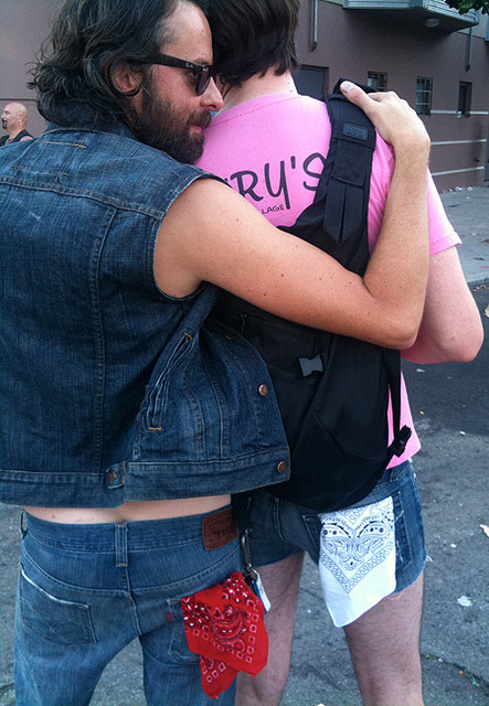 성소수자 커뮤니티에서 반다나를 사용한 것은 캘리포니아 골드 러시 이후 샌프란시스코에서 시작된 것으로 여겨진다. 여성 부족으로 인해 남성끼리 춤을 추는 경우, 스퀘어 댄스에서 파란색 반다나를 착용한 남성이 남성 역할, 빨간색 반다나를 착용한 남성이 여성 역할을 하는 코드가 개발되었다. 이 반다나는 보통 팔에 두르거나 벨트에 걸거나 청바지 뒷주머니에 넣었다.[2]2. 2. 1970년대 뉴욕