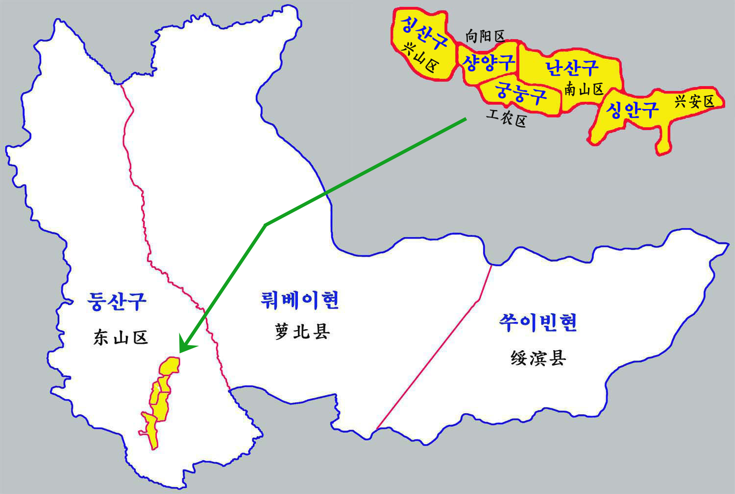 2011년 7월 14일: 둥산 구의 일부 지역이 싱산 구에 편입되었다. (6개 구 2개 현)