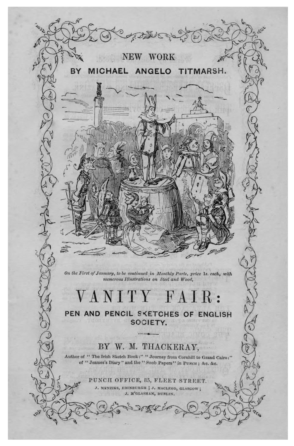 연재 소설의 부제는 ''영국 사회의 펜과 연필 스케치''였으며, 초기 제본 버전과 연재 소설 모두 새커리 자신의 삽화를 담고 있었다. 이것들은 때때로 상징적인 이미지를 제공했는데, 예를 들어 여성 등장인물을 사람을 잡아먹는 인어로 묘사하는 식이었다.