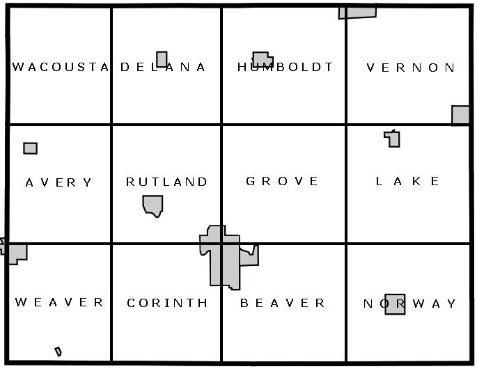 동쪽과 서쪽에 있는 모든 군과 달리 험볼트군은 12개의 타운십만 가지고 있다. 1851년 1월 15일에 표준 16개의 타운십으로 설립되었지만, 1855년에 폐지되었다.[12] 1857년 2월 26일에 재설립되었을 때, 포트도지의 존 덤컴이 군 내 남쪽에 있던 4개 타운십을 웹스터군에 "대여"하는 방식으로 할양했다.[34]