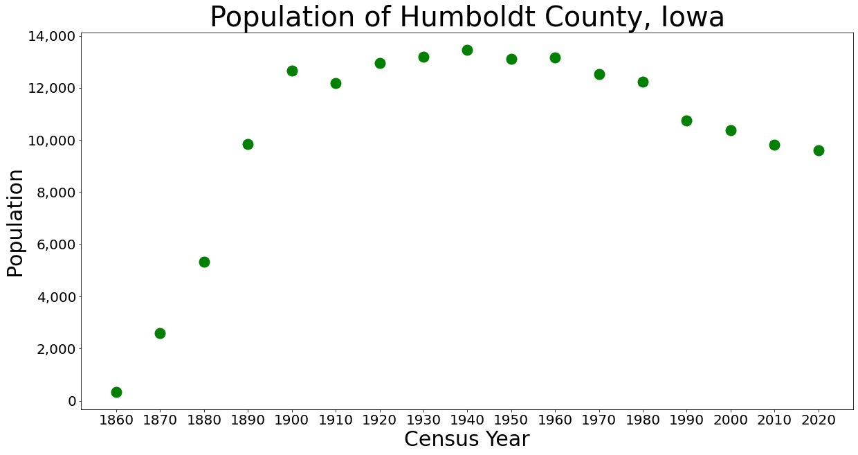 아이오와 주의 연방 가입은 1845년 3월 3일 의회에서 승인되었으며, 주 헌법과 경계 승인을 거쳐 1846년 12월 28일에 주 지위가 시작되었다. 아이오와 주 의회는 1851년 1월 15일에 법안을 통과시켜, 군 정부가 아직 설립되지 않은 주의 절반에 50개의 군을 만들었다. 험볼트 군은 이 법안에 의해 현재 면적과 함께 현재 웹스터 군의 4개 읍(잭슨, 디어 크릭, 배저, 뉴어크)을 포함하여 만들어졌다.[3] 이 군의 이름은 알렉산더 폰 훔볼트의 이름을 따서 지어졌다.[4] 1855년 1월 21일, 법안에 의해 험볼트 군의 북쪽 절반과 뱅크로프트 군이 코수스 군으로 병합되었고, 험볼트 군의 남쪽 절반은 웹스터 군으로 병합되었다.[5]제6대 의회는 험볼트 군을 재설립하는 또 다른 법안을 1857년 1월 28일에 통과시켰으며, 2월 26일에 발효되었다.[5] 그러나 실수로 하위 4개 읍(잭슨, 디어 크릭, 배저, 뉴어크)이 험볼트 군으로 반환되는 것이 누락되었다. 이 실수는 다음 의회 회기까지 발견되지 않았고, 의회는 1858년 3월 11일에 4개 읍을 포함하도록 험볼트 군을 재정의하는 법안을 통과시켰다.[6]