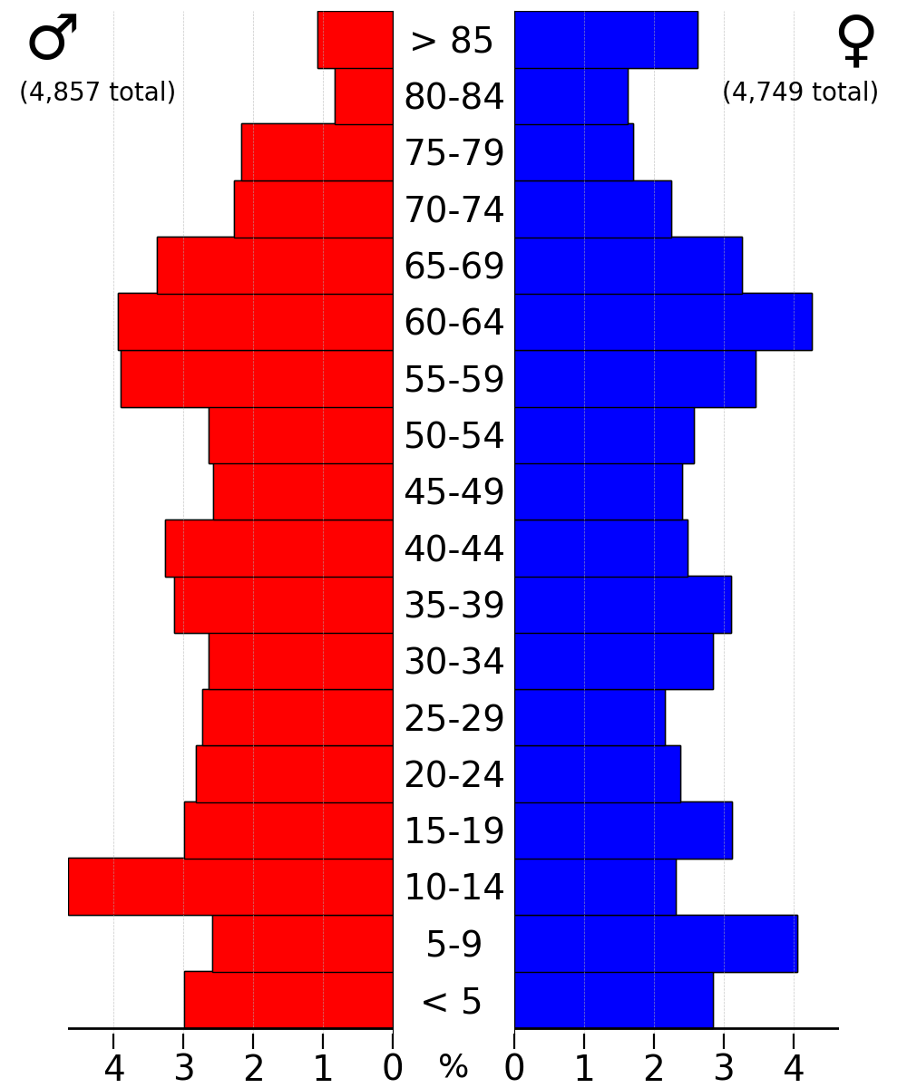 4,295가구 중 29.70%는 18세 미만의 자녀와 함께 거주했으며, 57.40%는 함께 사는 부부였고, 6.40%는 남편이 없는 여성 가구주였으며, 32.90%는 비가족이었다. 전체 가구의 29.80%는 개인으로 구성되었으며, 16.30%는 65세 이상인 혼자 사는 사람이 있었다. 평균 가구 규모는 2.38명, 평균 가족 규모는 2.94명이었다.[22]