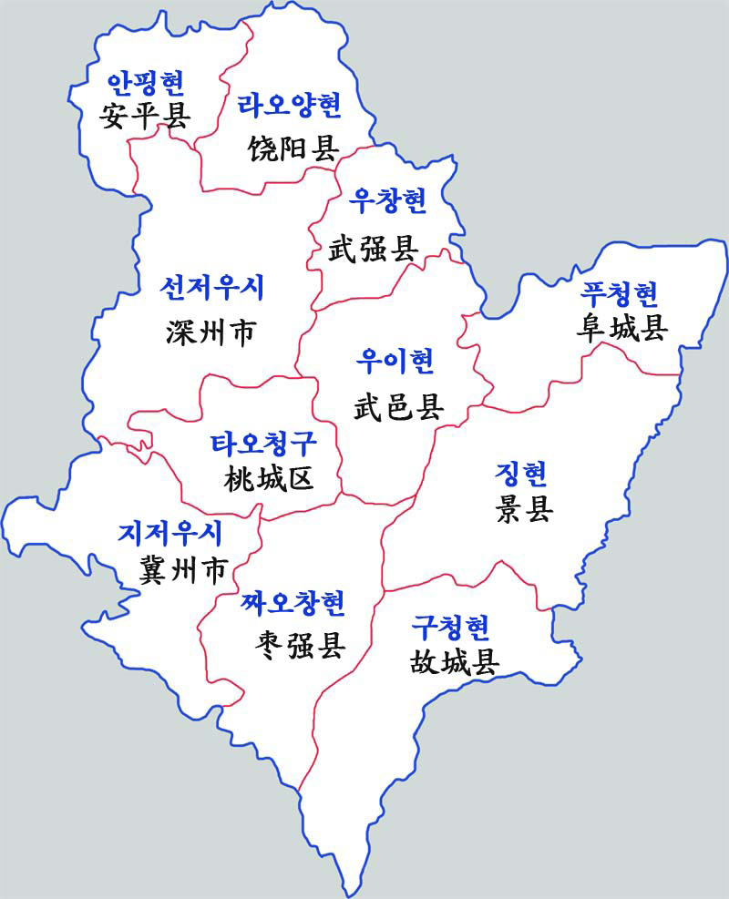 종류 이름 한자 한어 병음 인구 (2010년) 면적 (km2) 밀도 (/km2) 시할구 타오청 구 桃城区 Táochéng Qū 522,147 602.5km2 867 시할구 지저우 구 冀州区 Jìzhōu Qū 362,013 918km2 394 현급시 선저우 시 深州市 Shēnzhōu Shì 566,087 1244km2 455 현 짜오창 현 枣强县 Zǎoqiáng Xiàn 391,469 903km2 437 현 우이 현 武邑县 Wǔyì Xiàn 315,693 830km2 380 현 우창 현 武强县 Wǔqiáng Xiàn 214,549 442km2 485 현 라오양 현 饶阳县 Ráoyáng Xiàn 280,498 573km2 490 현 안핑 현 安平县 Ānpíng Xiàn 328,512 493km2 666 현 구청 현 故城县 Gùchéng Xiàn 487,025 941km2 518 현 징 현 景县 Jǐng Xiàn 528,693 1183km2 447 현 푸청 현 阜城县 Fùchéng Xiàn 341,087 698km2 489