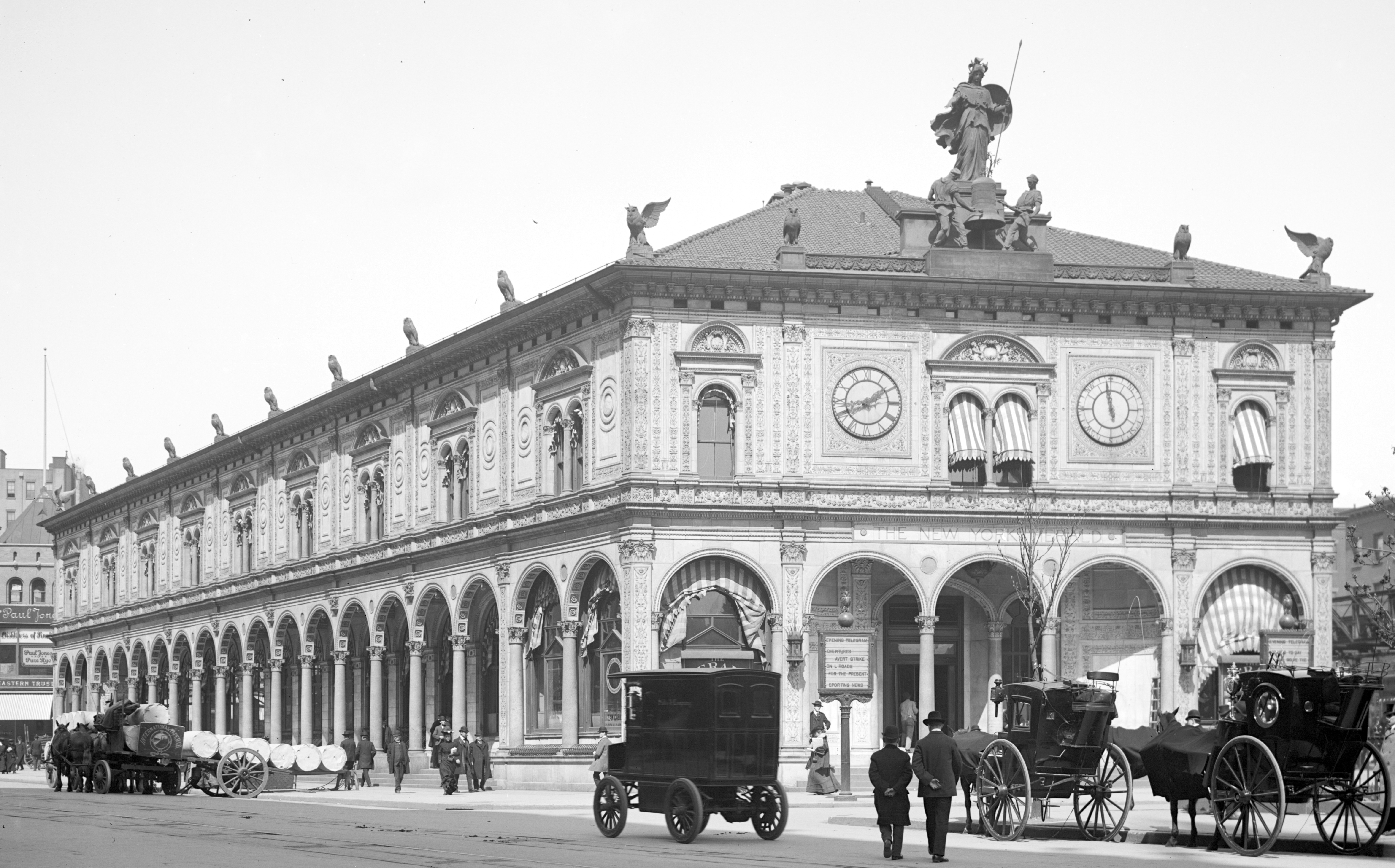 헤럴드 광장은 웨스트 34번가와 35번가 사이 광장의 북쪽 끝에 해당하며, 과거 ''뉴욕 헤럴드'' 건물이 위치해 있었다. 이 광장에는 조각가 안토닌 장 카를레스가 1895년에 제작한 거대한 기계식 시계가 있다.[1] 제임스 고든 베넷 기념비로 알려진 이 기념물은 지혜의 여신 미네르바가 종 앞에 있는 그녀의 올빼미들과 함께 밀포드 핑크색 화강암 받침대에 설치되어 있으며, 양옆에는 두 명의 종 치는 사람이 있다. 기념비의 종은 정각에 울리도록 설계되었다. "스터프"와 "거프"라는 별명이 붙은 두 명의 7피트 높이 청동 노동자들은 망치로 종을 치는 것처럼 보이지만, 실제로는 종 뒤에 있는 망치로 쳐진다. 이 조각상과 시계는 원래 1894년 광장에 위치했던 뉴욕 헤럴드 빌딩의 일부였다. 1921년 건물 철거 전에 조각상들은 제거되었고, 1940년에 광장에 다시 설치되었다.