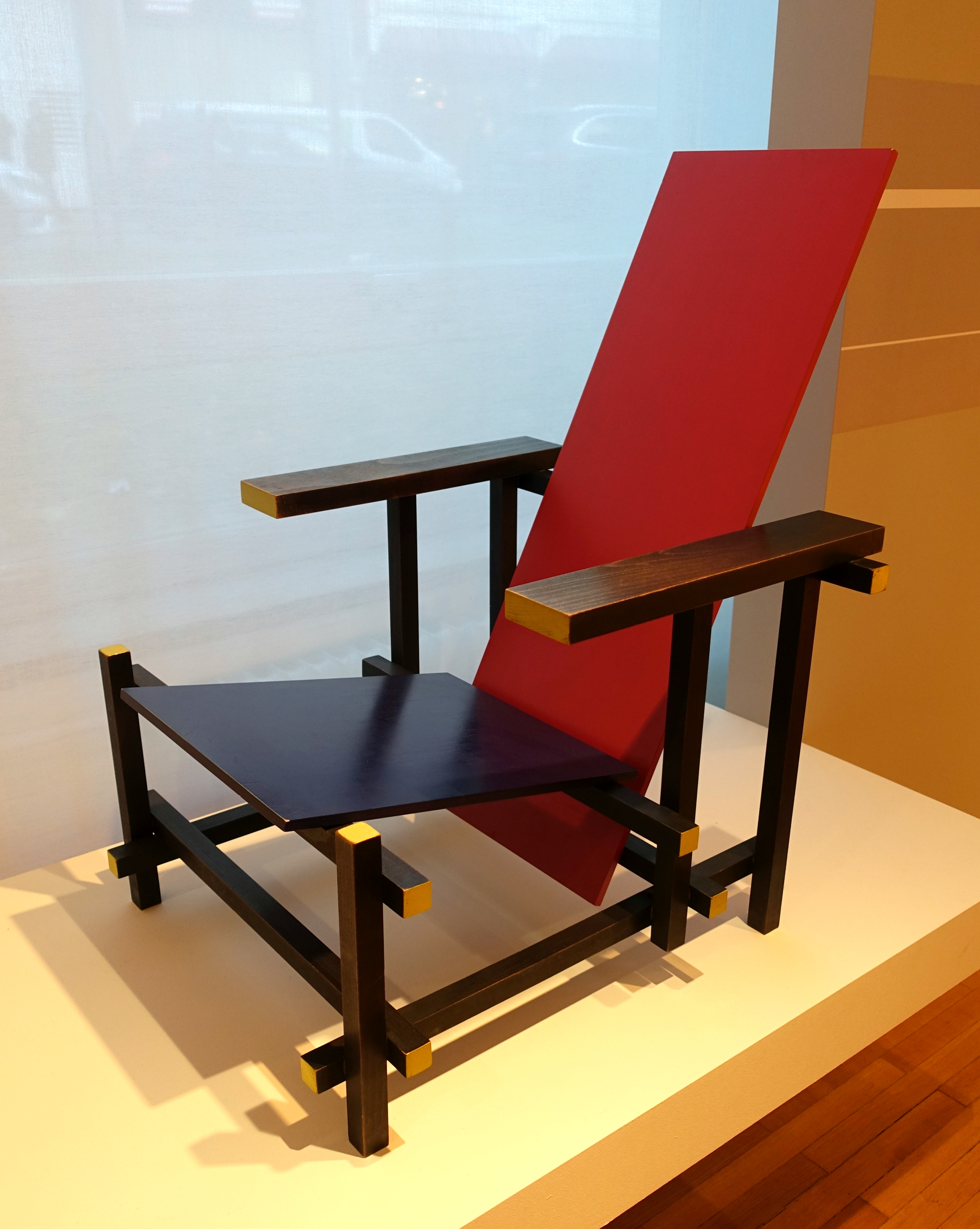 리트펠트는 1917년에 빨강 파랑 의자를 디자인했는데, 이는 현대 가구의 상징적인 작품이 되었다. 그는 가구 대부분이 수작업보다는 대량 생산되기를 바라면서 제작의 단순성을 추구했다.[4] 1918년에 그는 자신의 가구 공장을 시작했고, 1919년에 건축가가 된 அதே 해에 데 스테일 운동의 영향을 받아 의자 색상을 변경했다. 데 스테일에서 맺은 인연을 통해 그는 해외에서도 전시할 기회를 얻었다. 1923년, 발터 그로피우스는 리트펠트를 바우하우스에 초대하여 전시하게 했다.[5]