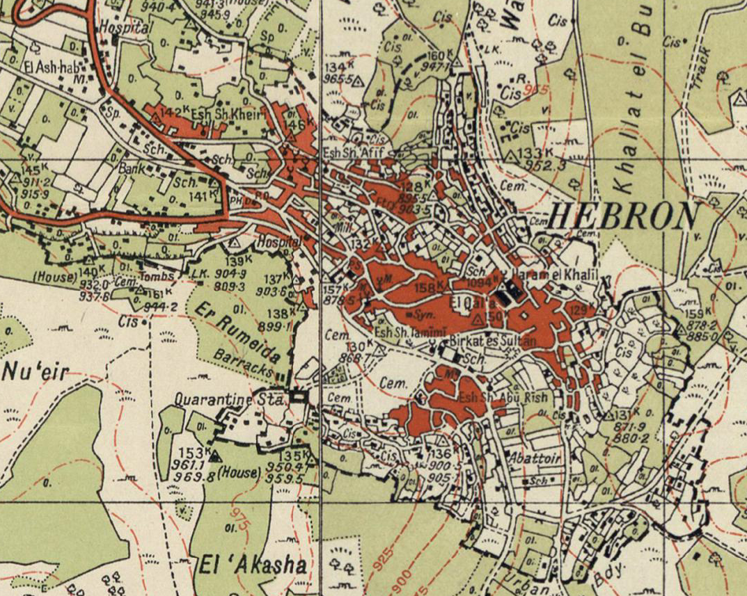 19세기 지도 두 장, 20세기 초 항공 사진, 그리고 이스라엘의 팔레스타인인의 이동의 자유 제한에 대한 21세기 지도의 헤브론 구시가지 모습이다. 1898년 지도에는 다음과 같은 범례가 포함되어 있다.[1]