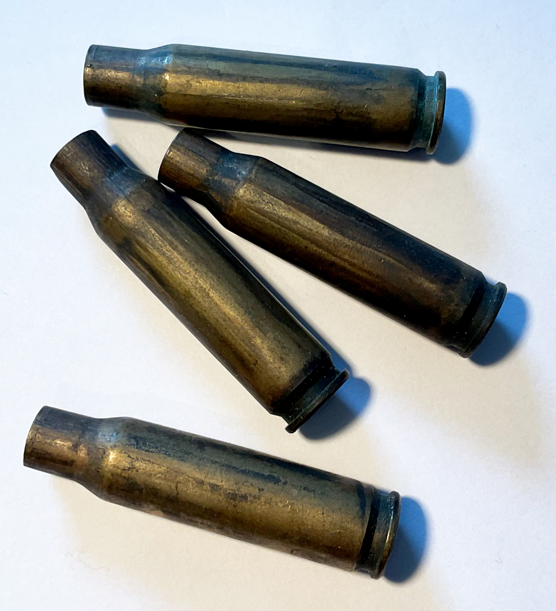 가스 배출 플루트에서 의도적인 추진제 가스 유입으로 인해 앞쪽 바깥 표면에 그을린 자국이 있는 발사된 탄피