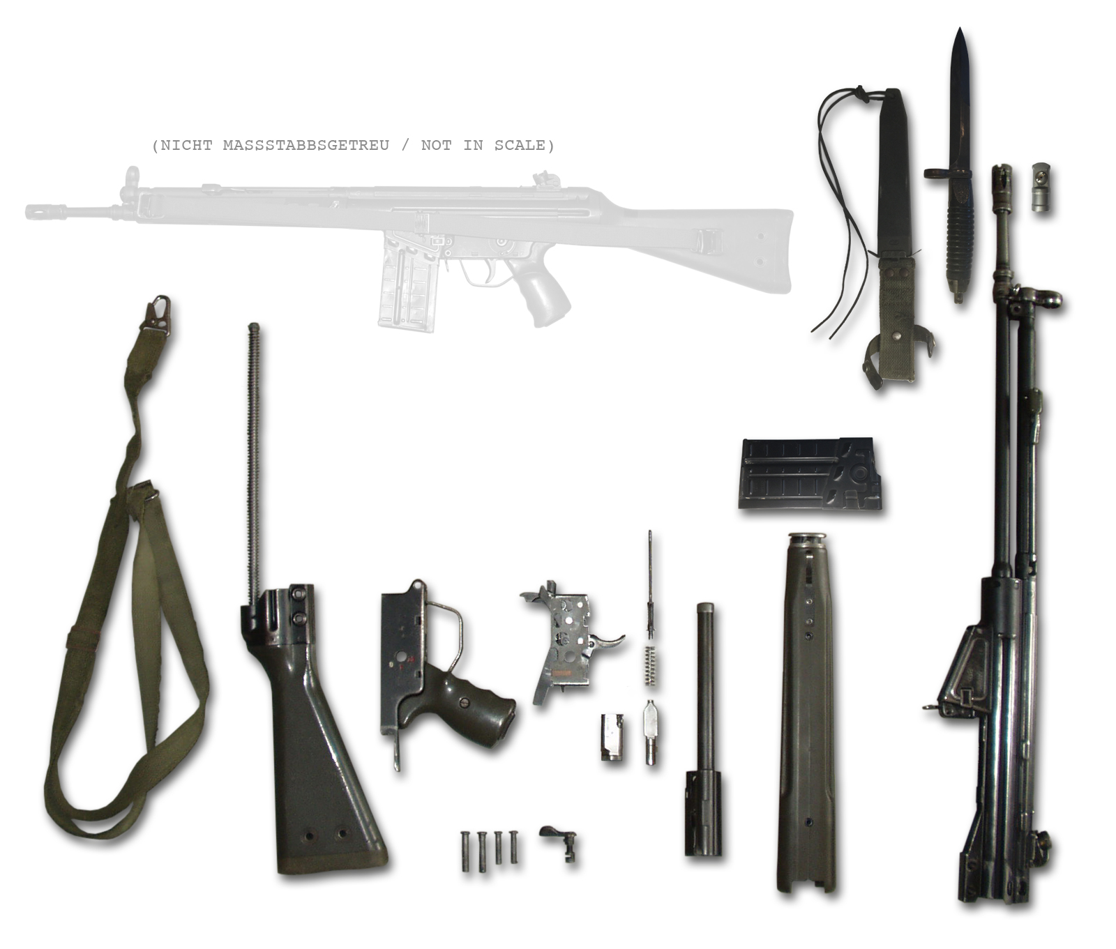 분해된 G3A3 소총, 모듈식 설계를 보여줌