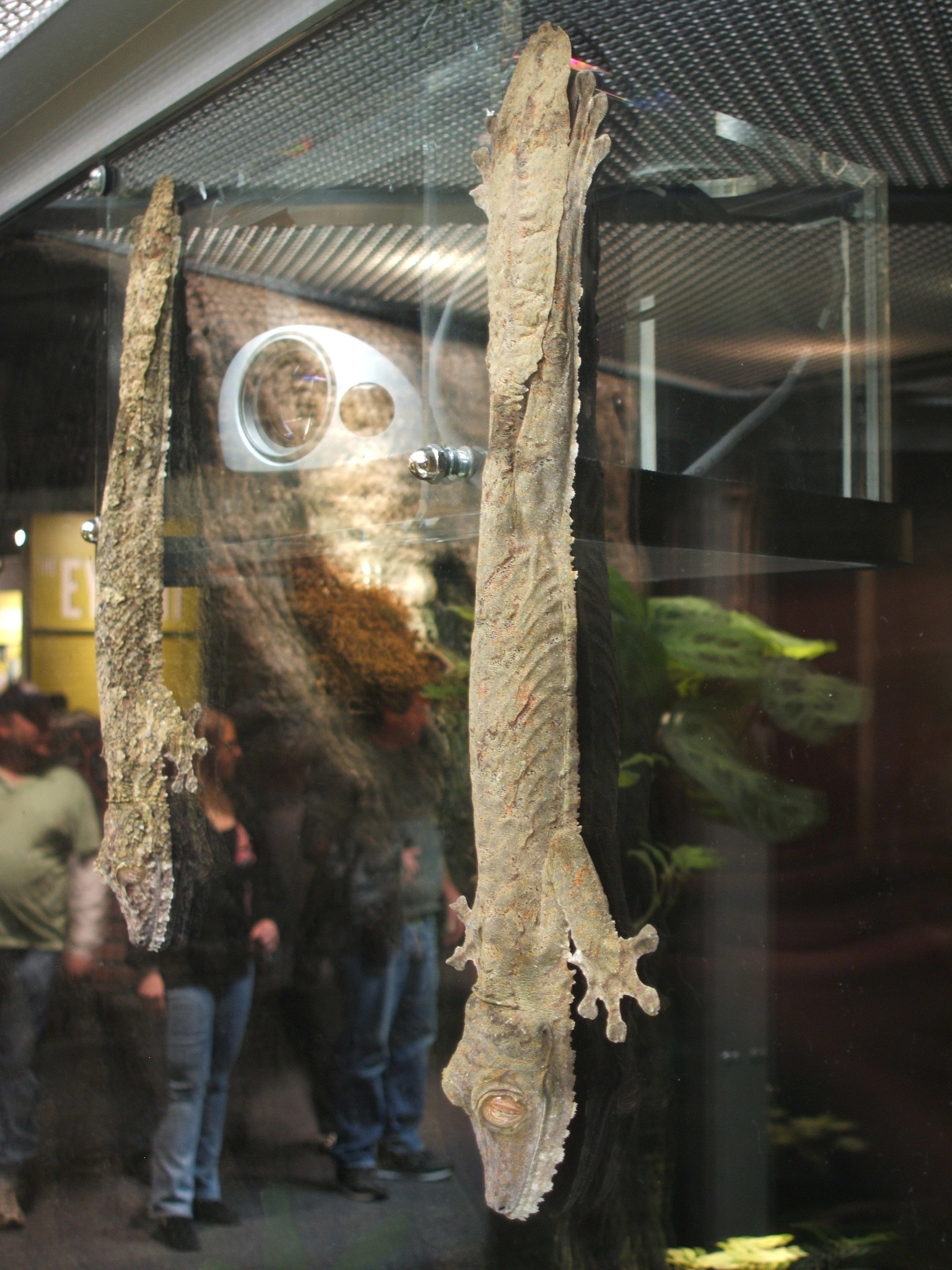 보스턴 과학박물관에 전시 중인, 머리를 아래로 향한 채 유리벽에 매달린 헨켈납작꼬리 두 마리