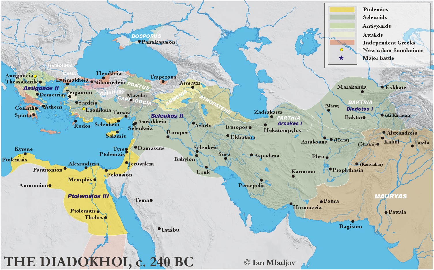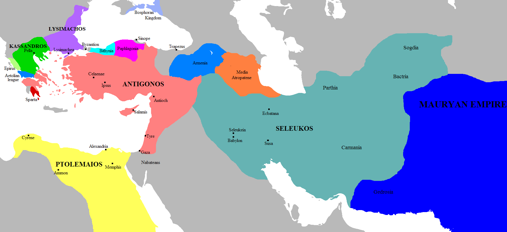 이 시점에서 헬레니즘 시대의 삼자 영토 분할이 이루어졌으며, 주요 헬레니즘 강국은 데메트리오스의 아들 안티고노스 2세 고나타스의 마케도니아, 프톨레마이오스의 아들 프톨레마이오스 2세의 프톨레마이오스 왕국, 그리고 셀레우코스 1세의 아들 안티오코스 1세 소테르의 셀레우코스 제국이었다.[31]