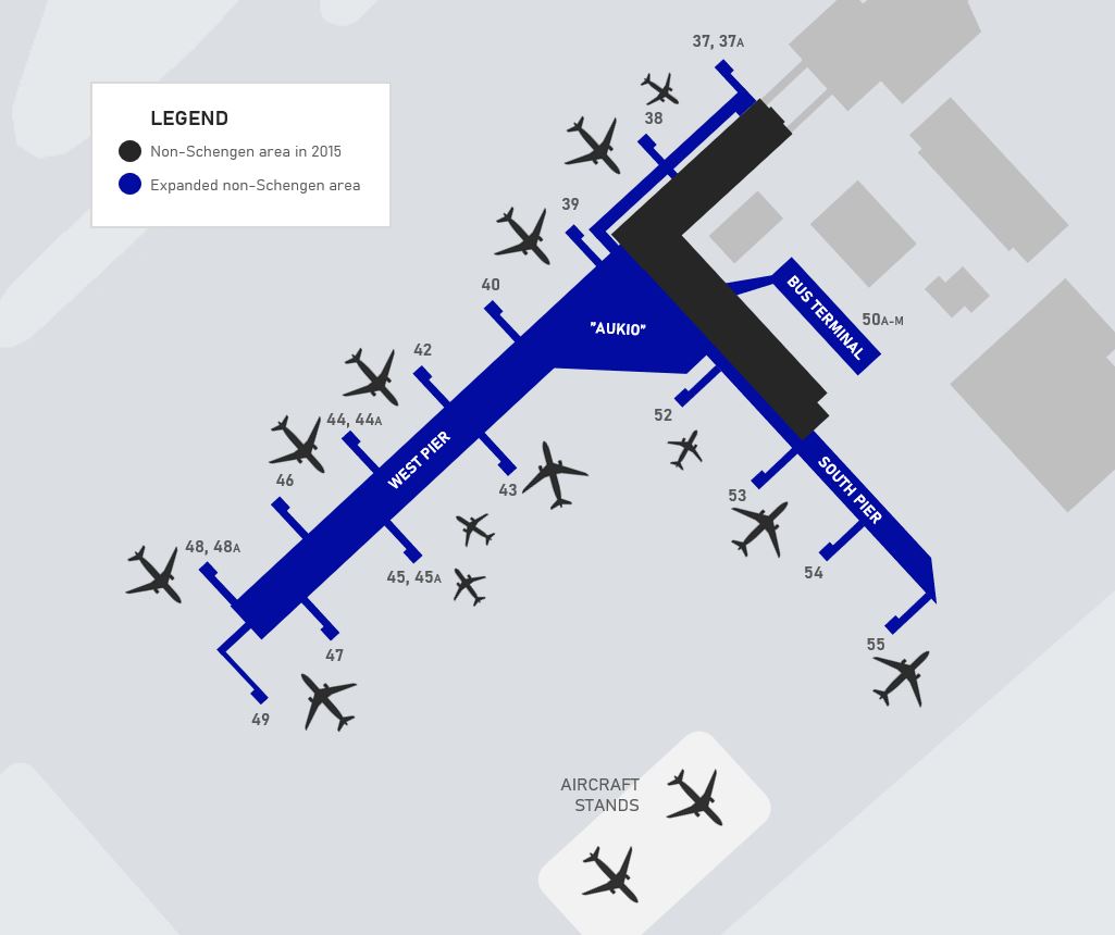 2009년 비솅겐 지역 확장 공사를 통해 대형 항공기 8대를 동시에 수용할 수 있게 되었고, 장거리 승객을 위한 쇼핑 및 스파 시설이 확충되었으며, 국내선과 국제선 구분이 없어졌다. 이후 지속적인 확장 공사가 이루어져, 2017년 6월에는 남쪽 부두가, 2019년 2월에는 중앙 광장인 아우키오(Aukio)가, 2019년 11월에는 에어버스 A380과 같은 초대형 항공기 수용이 가능한 서쪽 부두가 개장했다. 서쪽 부두의 일부 게이트는 보잉 737이나 에어버스 A320 같은 중소형 항공기 두 대를 동시에 처리할 수 있도록 설계되었다. 또한, 2016년 6월에는 원격 주기장 운영을 위한 버스 터미널(50A-M 게이트)이 개장하여 공항 수용 능력을 높였다. 터미널은 도착층과 출발층으로 분리되어 운영된다.