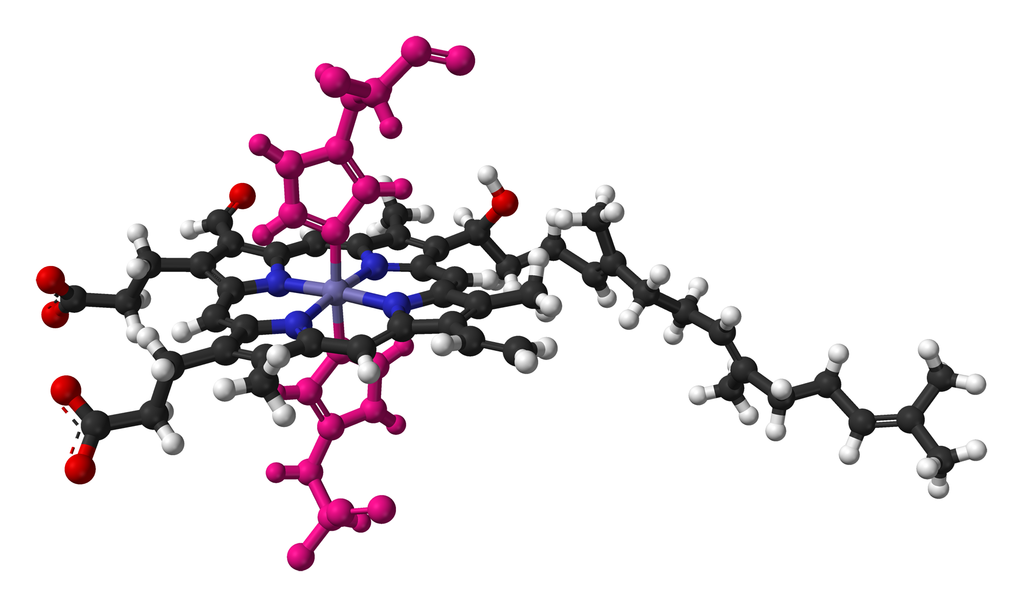 사이토크롬 c 산화효소의 일부인 사이토크롬 a의 헴 A는 두 개의 히스티딘 잔기(분홍색으로 표시)와 결합되어 있다.[13]
