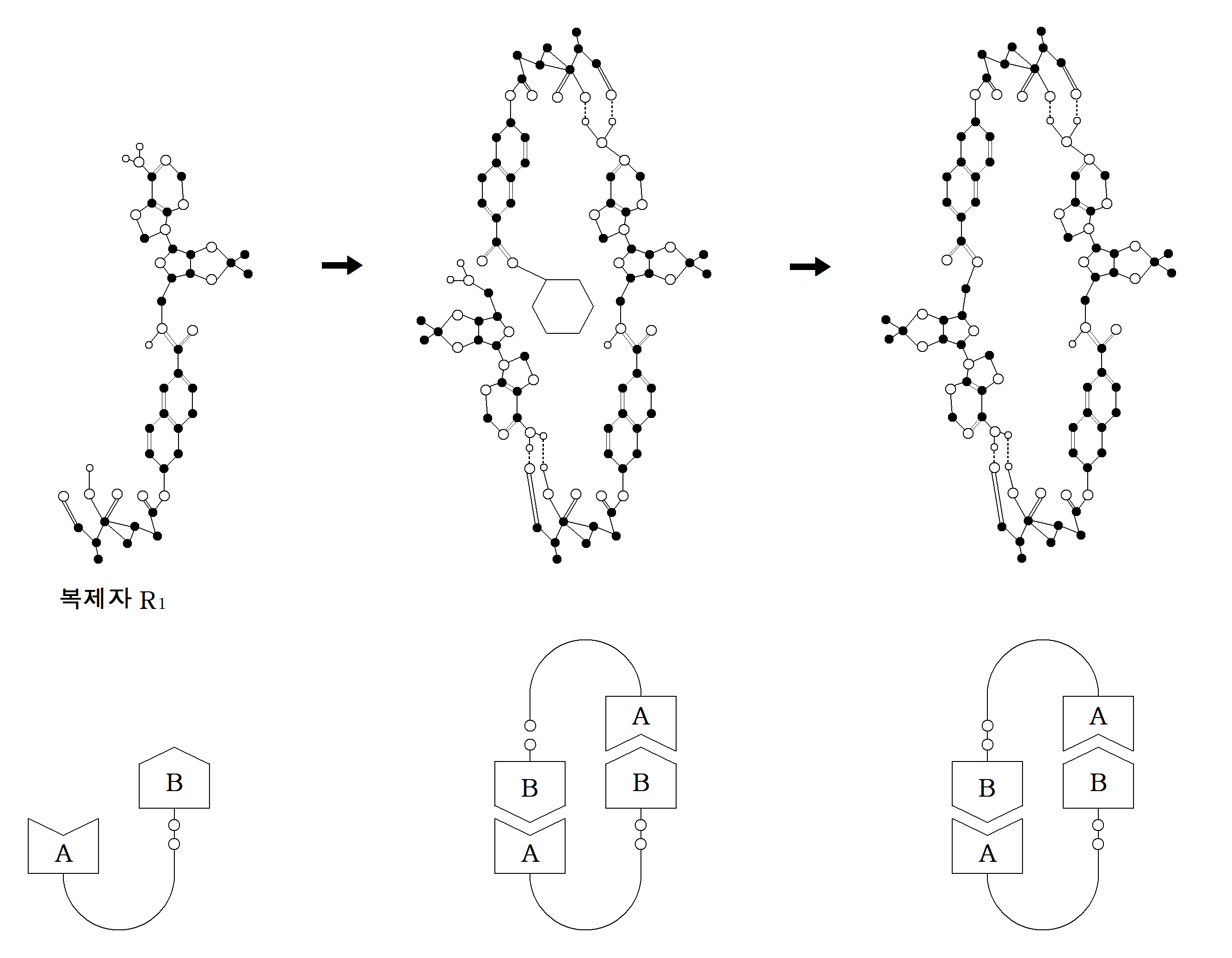 자기 복제는 유전정보를 전달한다는 의미에서 생명체에게 매우 중요한 성질이다. 1989년 미국의 화학자 레벡(Rebek)은 스스로 복제가 가능한 분자의 존재를 발표하였다. 이 분자는 수소 결합을 통해 결합하는 두 조각 A와 B로 이루어져 있다. 이 분자에는 상보적인 두 끝이 있어서 각각 새 조각과 결합할 수 있다. A 끝은 B 조각과 결합하고, B 끝은 A 조각과 결합한다. 이렇게 하여 원 복제자의 주형에서 새 복제자가 조립된다.