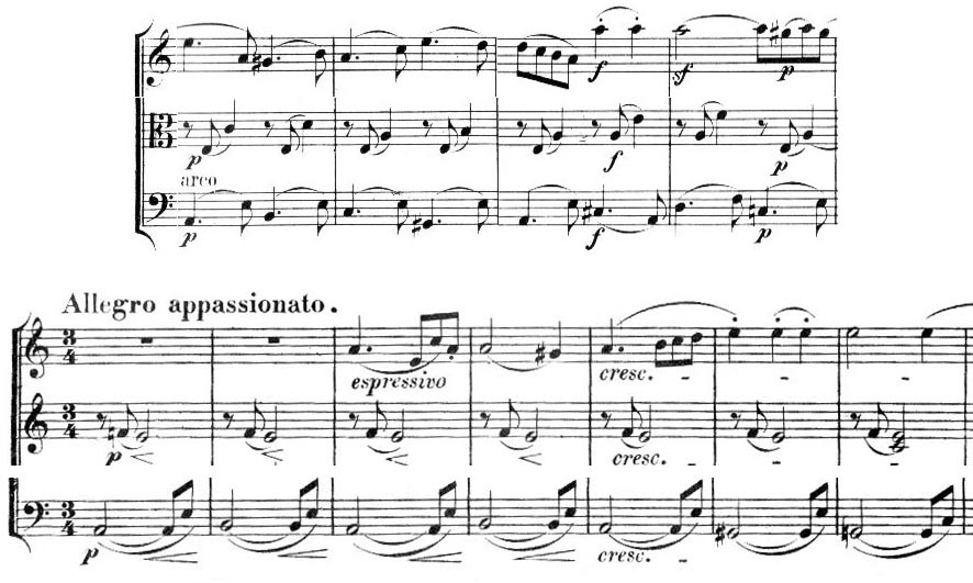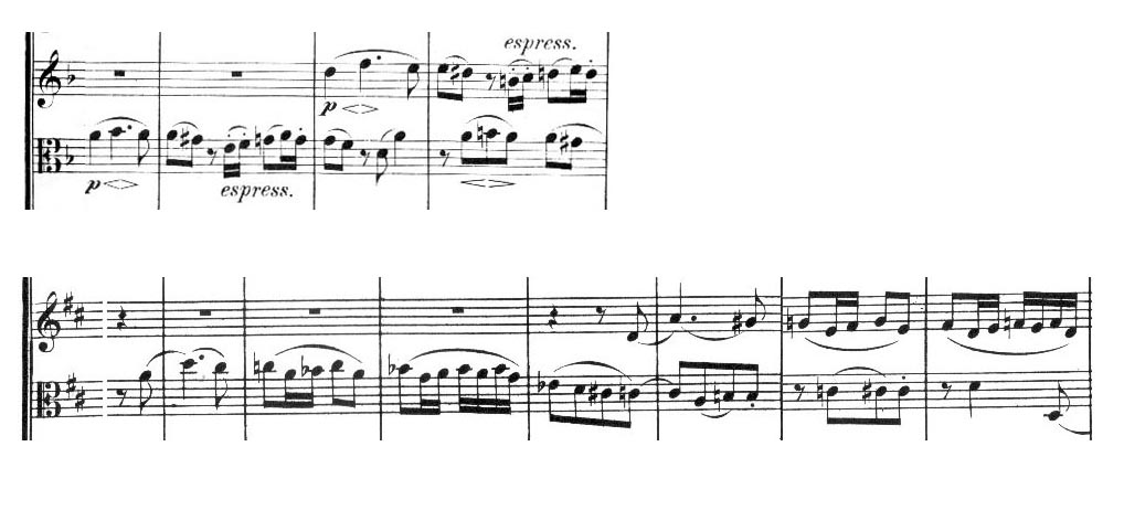 멘델스존 작품 13의 느린 악장(상단)과 베토벤 작품 95(하단)의 푸가 모티프. 제2 바이올린과 비올라 파트가 표시되어 있습니다.