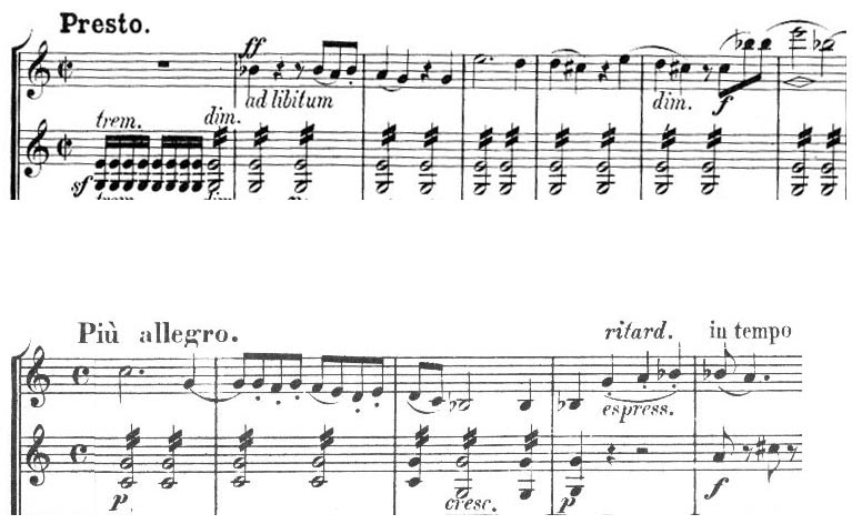 멘델스존 사중주(상단)와 베토벤 작품 132(하단)의 마지막 악장을 소개하는 트레몰로 반주가 있는 바이올린 카덴차. 제1 및 제2 바이올린 파트가 표시되어 있습니다.