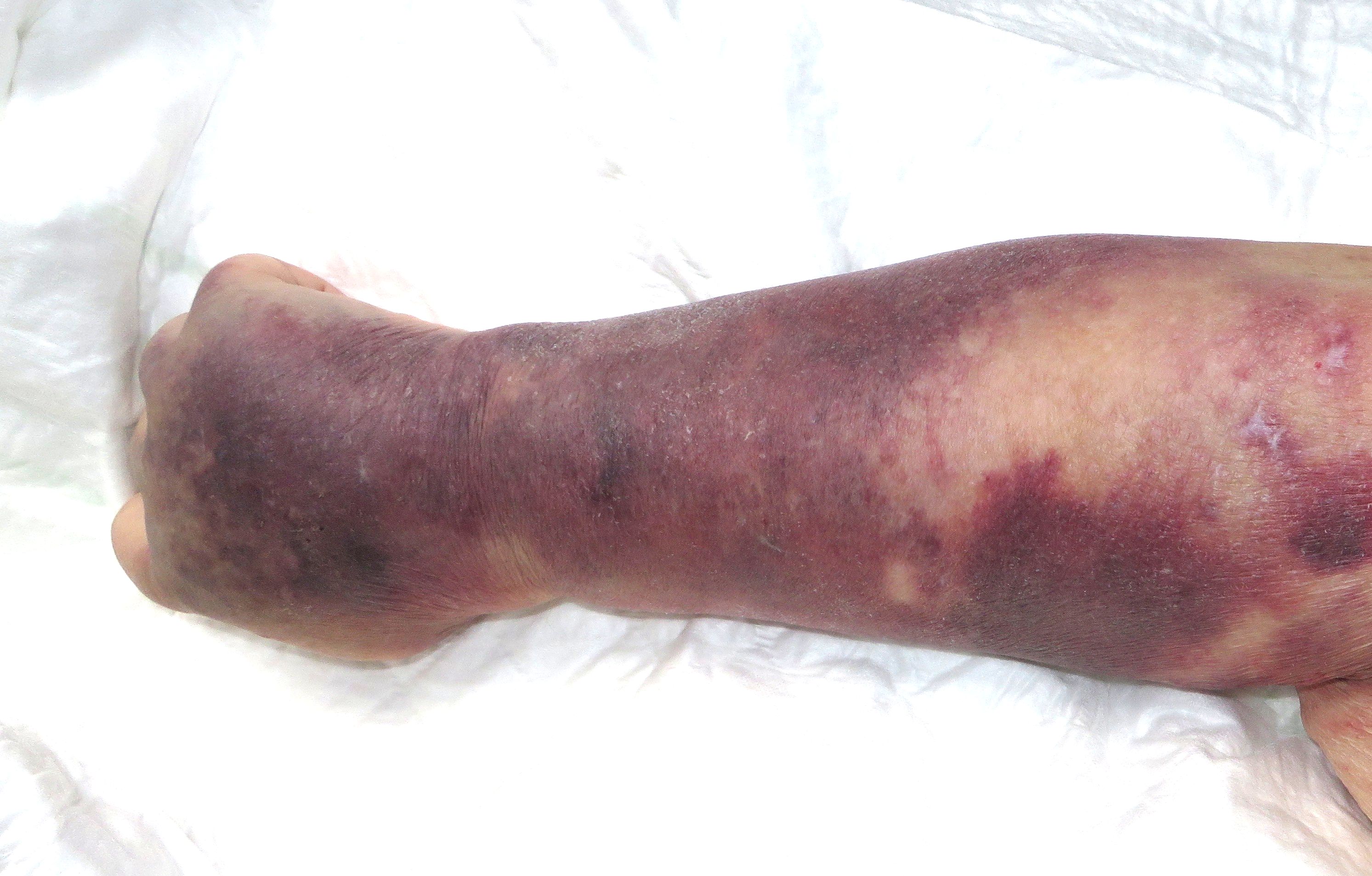 - 피부 증상: 피부 아래의 자연적인 출혈로 인해 멍이 쉽게 들 수 있다. 특히 팔뚝에는 자반(보라색 반점)이, 발, 다리, 점막 등에는 점상 출혈(작은 붉은 반점)이 나타날 수 있다.[51][52]