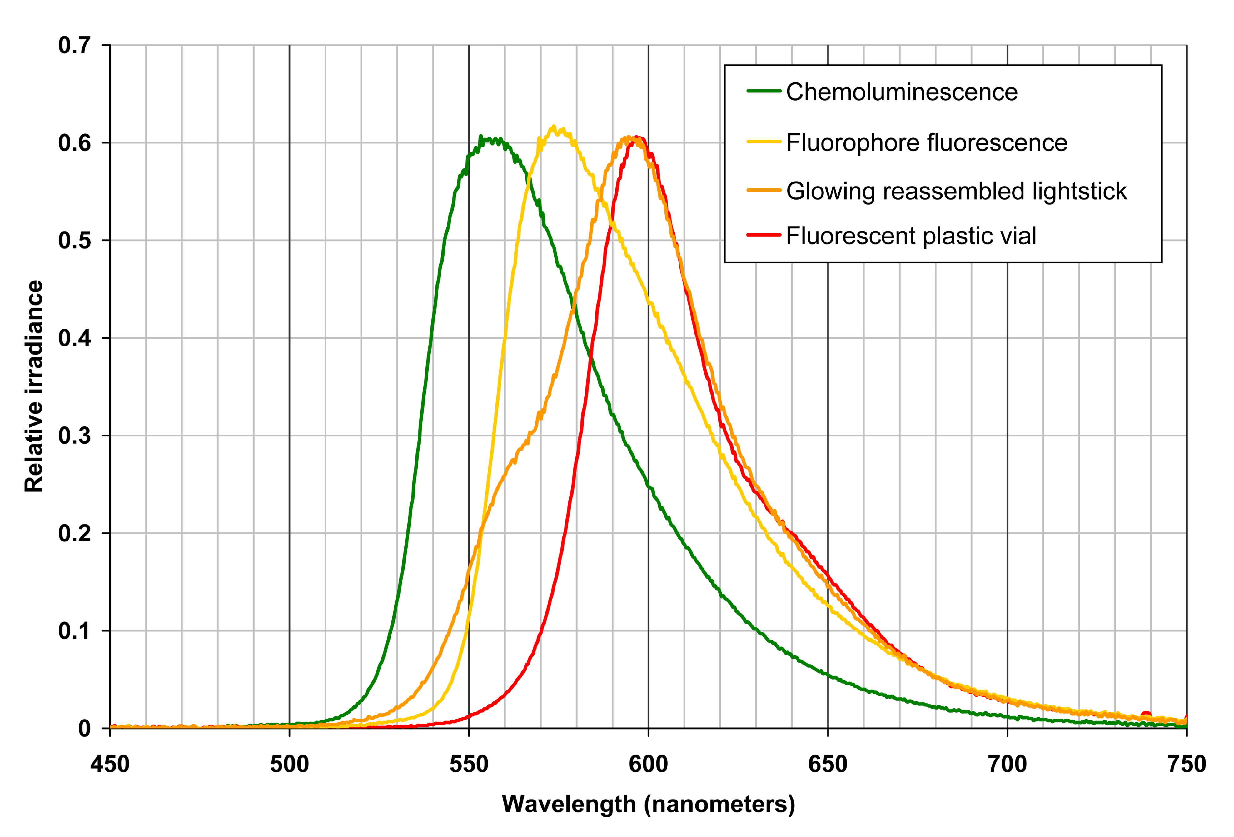 형광봉이 내는 빛의 색깔은 사용되는 형광체(염료)의 화학 구조에 따라 결정된다. 화학 발광 반응에서 생성된 에너지가 형광체 분자를 들뜬 상태로 만들고, 이 분자가 다시 안정된 상태로 돌아가면서 특정 파장의 빛(광자)을 방출하는 원리이다.[18]