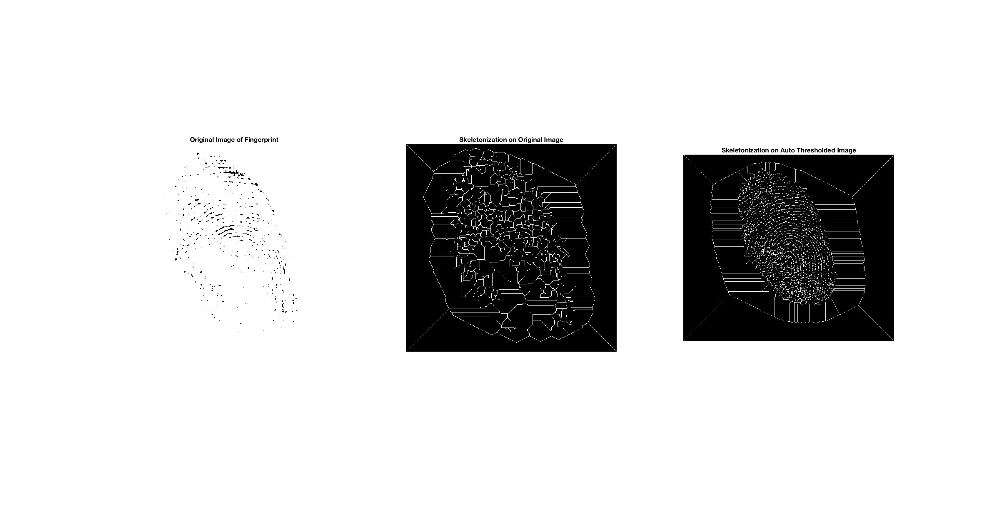 실제로 골격화를 수행하기 전에, 간단한 자동 임계값 설정을 통해 회색조 이미지를 이진 이미지로 변환하는 전처리를 적용하면 골격화 알고리즘이 이미지의 특징선을 더 효과적으로 추출하여 얇은 골격을 생성할 수 있다. 이미지의 대비가 높을수록 골격의 선들이 더 정확하게 연결되어, 부분적인 정보만 가진 원본 지문 이미지로부터도 특징을 더 잘 나타내는 골격을 재구성하는 데 유리하다. 즉, 적절한 전처리는 골격화의 성능을 높이는 중요한 단계이다.