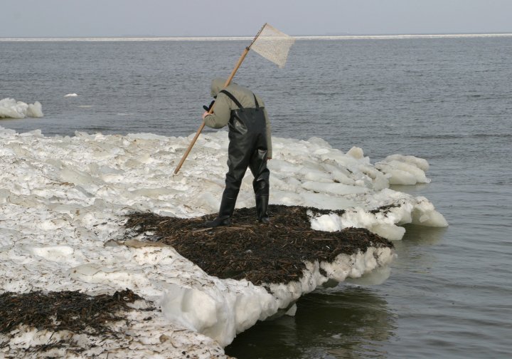 발트해 연안에서 호박을 잡는 모습. 겨울 폭풍이 호박 덩어리를 휩쓸어 낸다. 폴란드 그단스크 근처