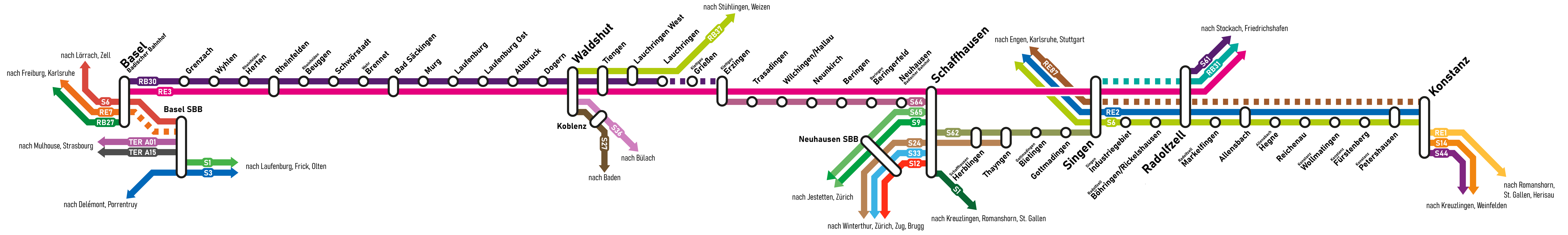 레기오날 익스프레스 (RE) | RE 2 | DB 레기오 바덴-뷔르템베르크 | 징겐 – 콘스탄츠 | 흑림 철도 연계 |