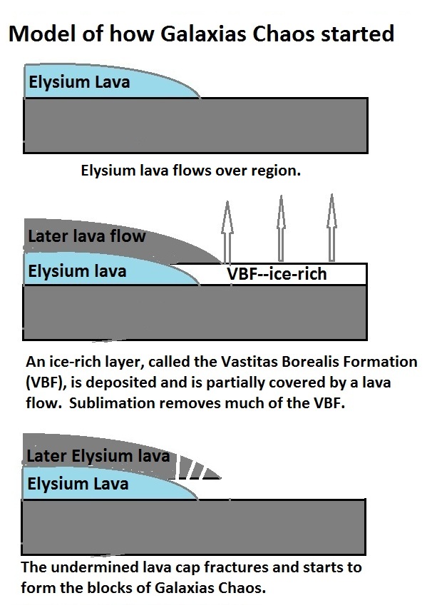 과학자들은 혼돈 지형의 원인에 대한 다양한 아이디어를 생각해냈다. 땅에서 빠르게 빠져나가 혼돈을 만든 물의 근원에 대한 한 가지 설명은 물이 풍부한 퇴적물이 바다 바닥의 거대한 협곡에 퇴적되었다는 것이다. 나중에 바다가 사라지자 퇴적물이 얼어붙었다. 뜨거운 마그마가 이 지역 근처로 오면 얼음이 녹아 거대한 지하 강 시스템을 형성했을 것이다. 이러한 강이 표면에 접근하면 엄청난 양이 땅에서 터져 나와 오늘날 우리가 볼 수 있는 계곡을 만들었을 것이다. 화성에 바다가 있었다는 증거가 많다.[12][13][14][15] 지하 강이 혼돈 지역에서 흘러나오기 위해 물을 남겨두었을 때 지면이 붕괴된 곳일 수 있는 장소가 사진 촬영되었다.[16][17] 물의 근원에 대한 최초의 이론 중 하나는 오래된 ''바이킹'' 궤도선 사진을 기반으로 했다. 이러한 유출은 남극의 녹은 물에서 물을 모으는 지구 규모의 냉동권에 갇힌 대수층에서 나온 것으로 생각되었다.[18][19] 냉동권은 행성 역사상 헤스페리안 시대에 행성의 상부 지각으로 형성되었을 것이다.[17] 갈락시아스 혼돈과 같은 혼돈 지형은 얼음이 풍부한 퇴적물의 승화로 인해 발생할 수 있다.[20]