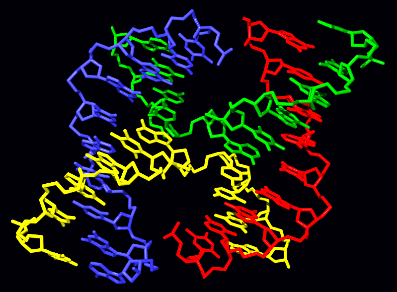 겹쳐진 홀리데이 접합의 분자 구조. 파란색과 빨간색 가닥은 나선형을 유지하고, 녹색과 노란색 가닥은 두 도메인 사이를 교차한다.