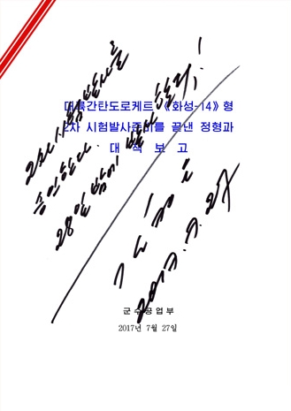 1 | 2017년 7월 4일 [24] | 평안북도 방현 비행장 부근, 북위 39.872126도 동경 125.269258도[25] | 없음 | 성공 | 2단 추진체와 소형 재진입체를 추가한 화성-12형의 ICBM 변종이 고각 발사로 발사되어 정점 고도 2802km에 도달했으며, 동해에 933km 떨어진 곳에 착탄했다. |