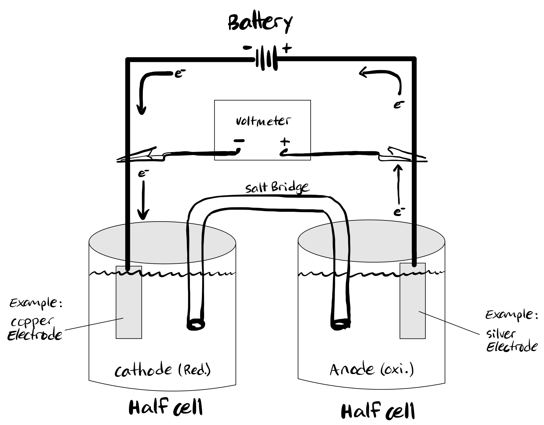 두 개의 서로 다른 금속(예: 아연과 구리)을 전선으로 연결한다. 각 금속은 별도의 용액에 담겨 있으며, 종종 금속의 수용액 황산염 또는 질산염 형태를 사용하지만, 더 일반적으로는 금속 염과 전류를 전도하는 물을 사용한다.[4] 염다리 또는 다공성 막이 두 용액을 연결하여 전기적 중성을 유지하고 전하 축적을 방지한다. 금속의 산화/환원 전위 차이가 화학 평형에 도달할 때까지 반응을 유도한다.[1]