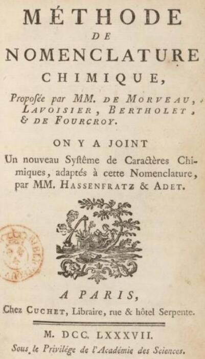 [12] 서적 Method of chymical nomenclature, proposed by Messrs. de Morveau, Lavoisier, Bertholet, and de Fourcroy: To which is added A new system of chymical characters adapted to the nomenclature by Mess. Hassenfratz and Adet https://archive.org/[...] G. Kearsley
