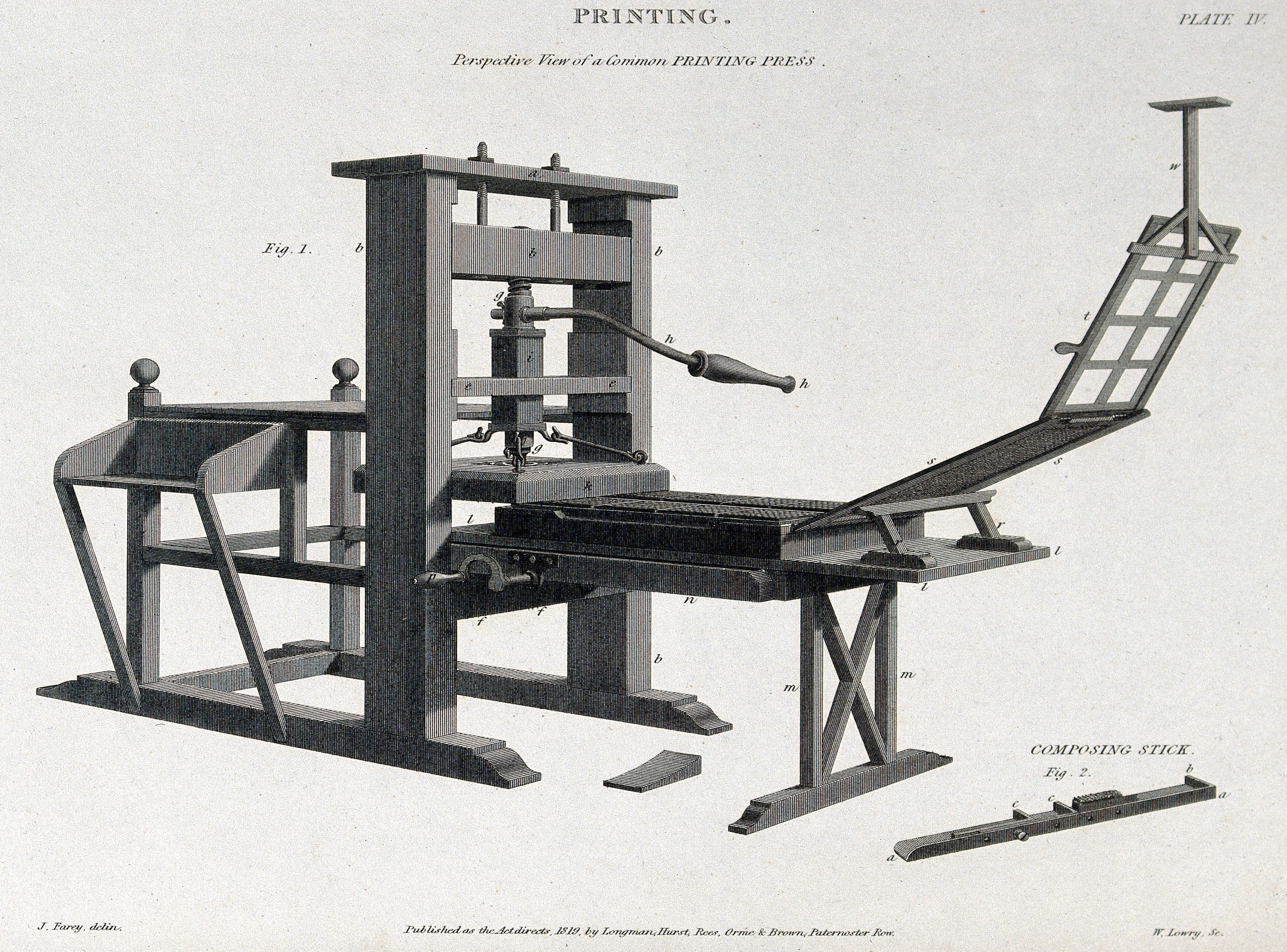 요하네스 구텐베르크는 1440년경 서양에서 재사용 가능한 활자를 조합하여 현대적인 활판 인쇄술을 개발했다. 구텐베르크는 포도주 압착기를 기반으로 목재 인쇄기를 발명했는데, 가죽으로 덮인 잉크 롤러로 활자 표면에 잉크를 묻히고 종이를 손으로 조심스럽게 위에 올려놓은 다음 패딩된 표면 아래로 미끄러뜨리고 큰 나사산 나사로 압력을 가했다. 그의 "나사식 인쇄기"는 구텐베르크 성경을 인쇄하는 데 사용되었다.[5] 15세기 중반 이전에는 유럽에서 인쇄소가 알려지지 않았지만, 1500년까지 모든 주요 대도시에서 발견되었다.[6]