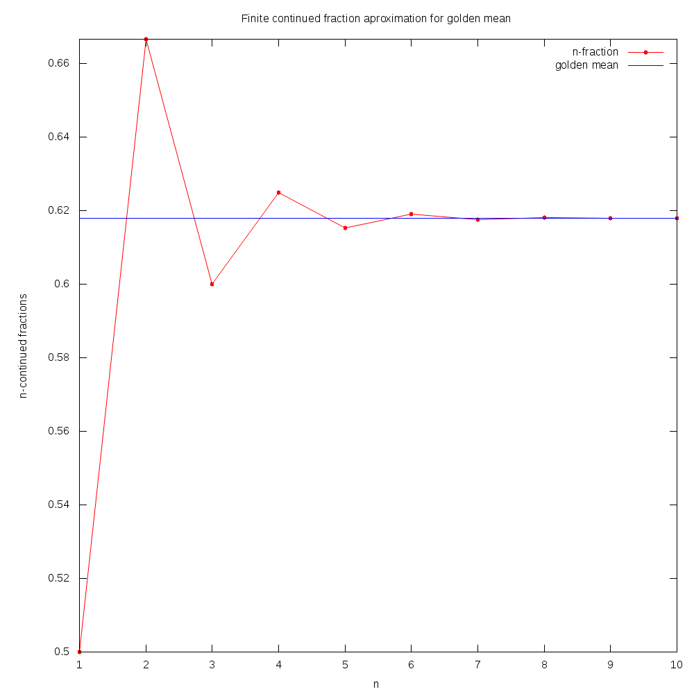 이러한 연분수의 수렴은 , , , , , 또는 , , , , , 이며, 연속적인 피보나치 수의 비율이다. 연분수의 일관적으로 작은 항들은 근사값들이 매우 느리게 수렴하는 이유를 설명한다. 이것은 황금비를 디오판토스 근사에 대한 후르비츠 부등식의 극단적인 경우로 만든다. 후르비츠 부등식은 모든 무리수 에 대해 다음과 같은 무한히 많은 서로 다른 분수 가 존재한다고 말한다.[25]