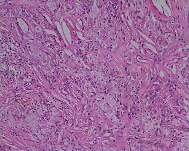 황색종의 조직학적 사진, 지질이 풍부한 거품 세포와 큰 콜레스테롤 열극을 보여준다, 10배 확대, 에오신 및 헤마톡실린 염색