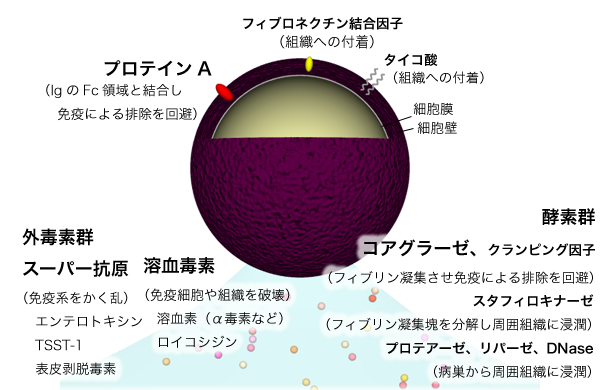 - 프로테인 A: 황색포도상구균 대부분이 가지고 있는 세포벽 단백질로, 항체(면역글로불린)의 Fc 영역에 결합한다. 이를 통해 항체의 생물학적 활성을 억제하여 세균이 면역계에 의해 제거되는 것을 막는다.
