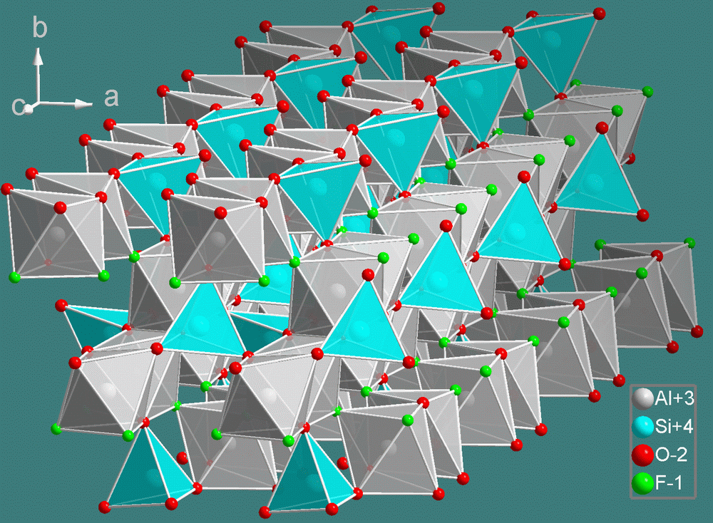 황옥의 결정 구조는 알루미늄 팔면체(회색), 실리카 사면체(파란색), 산소(빨간색), 불소(녹색)로 이루어져 있다.[26]