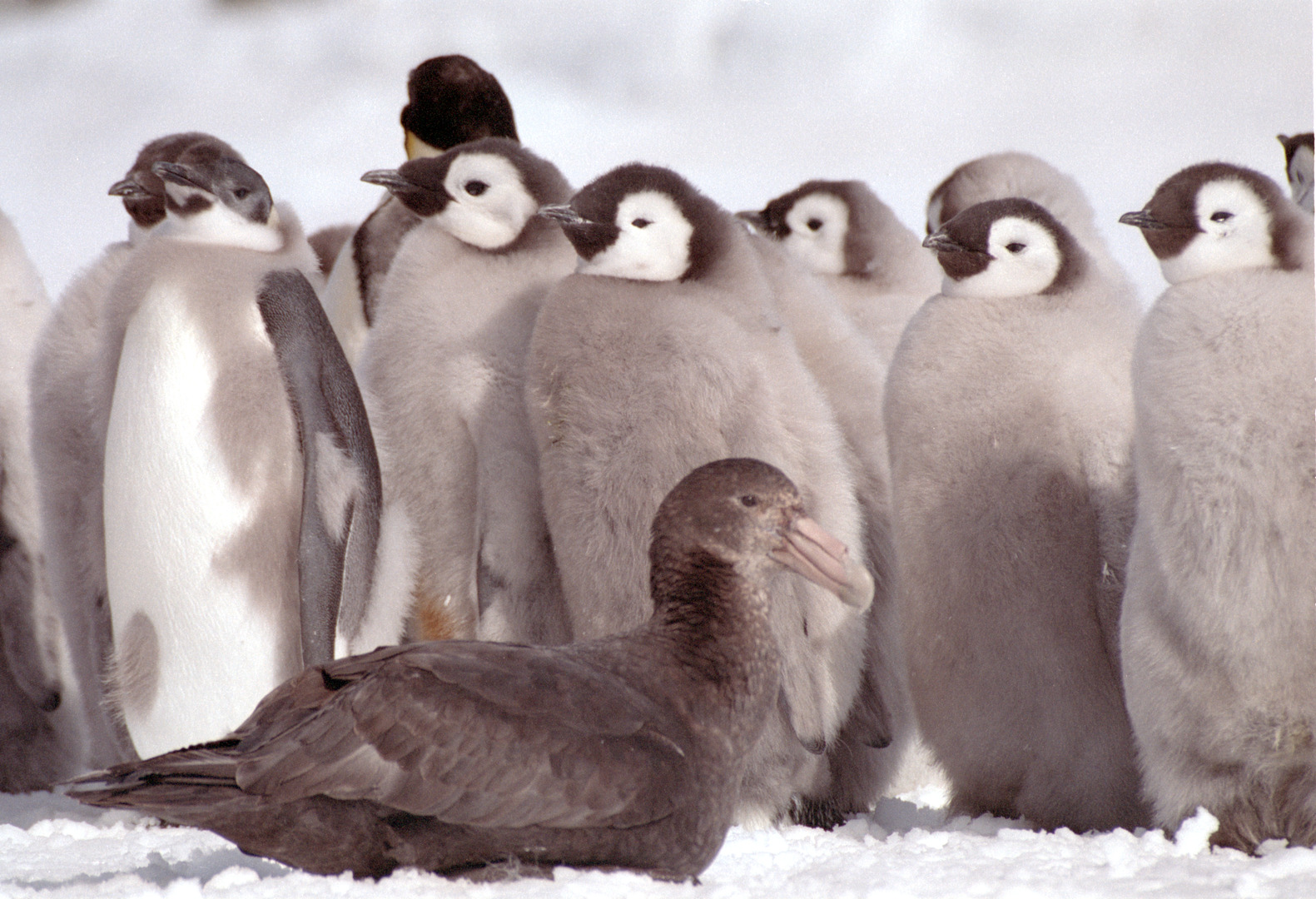 - '''남극슴새''': 주로 죽은 새끼를 먹는다. 살아있는 새끼는 이들이 군집에 도착하는 시점에는 이미 너무 커서 공격하기 어렵기 때문이다.[64]
