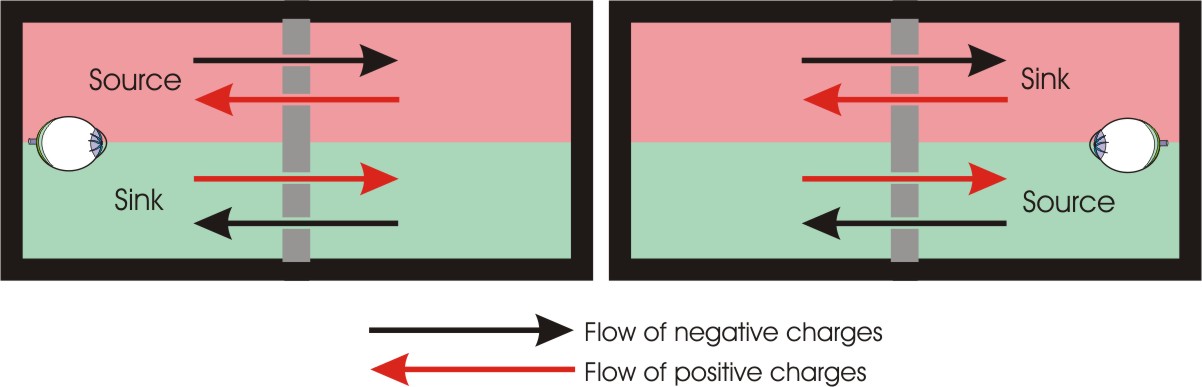 소스는 목적 회로에 전력을 공급하는 개념이며, 목적 회로 입장에서는 전력을 받아 사용하는 것이다. 반대로 싱크는 목적 대상에서 전력을 만들어 싱크 쪽으로 흘려보내는 개념이다. 즉, 관찰 대상인 목적 회로에서 전력을 만들어 공급해야 하는 상황을 의미하며, 이는 보통 목적 회로 내 어딘가에 다른 소스가 존재함을 뜻한다 (에너지 보존법칙). 예를 들어, BJT의 이미터 공통 회로에서는 콜렉터 쪽에 외부 전원 소스가 연결되어 전력을 공급한다.