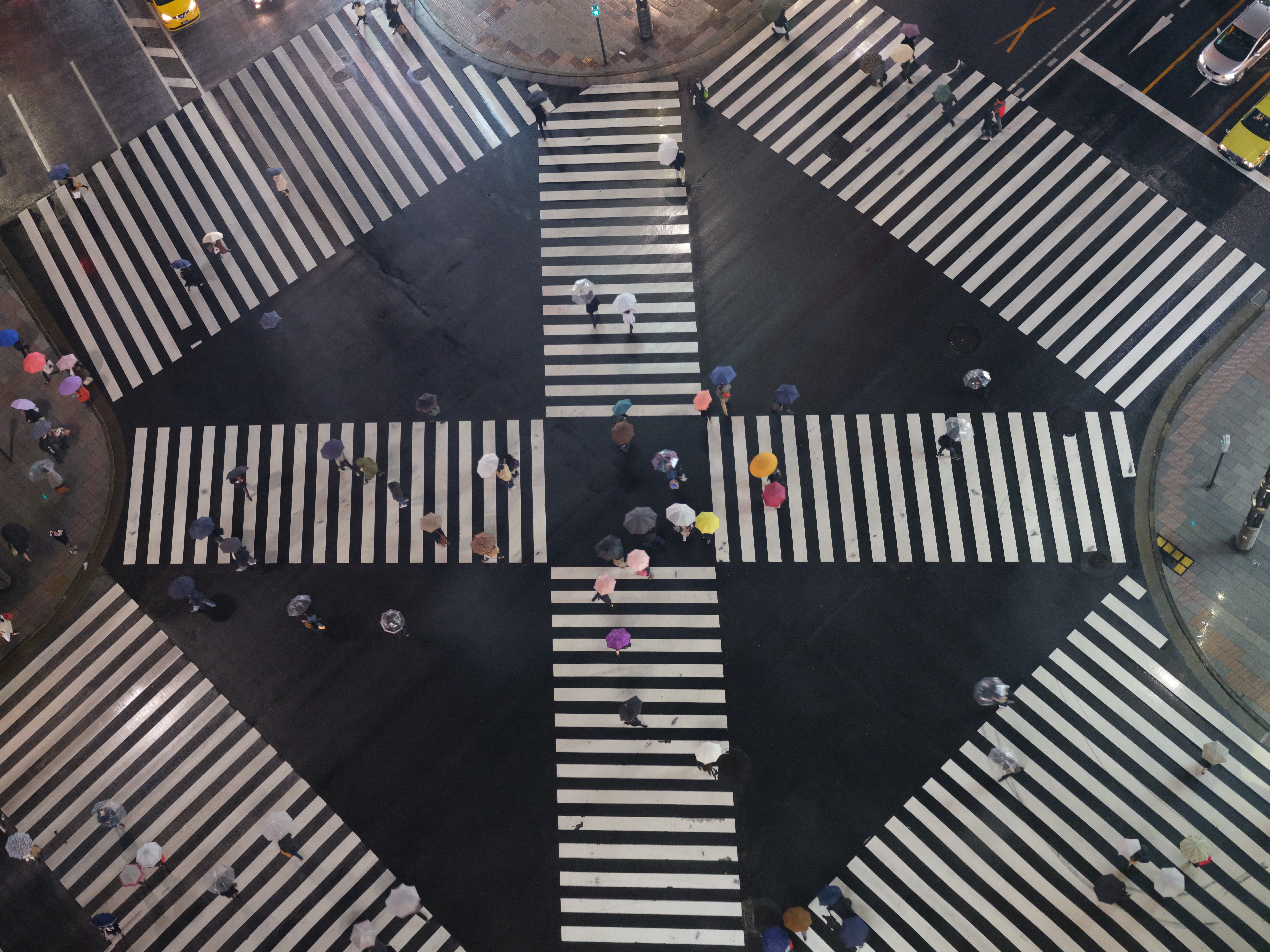시부야 스크램블 교차점은 일본 도쿄 시부야에 있는 오거리 교차로로, 대각선 횡단보도를 포함하여 세계적으로 유명하며, 특정 시기에 많은 인파가 몰리는 곳이다. - 횡단보도 - 대각선 횡단보도