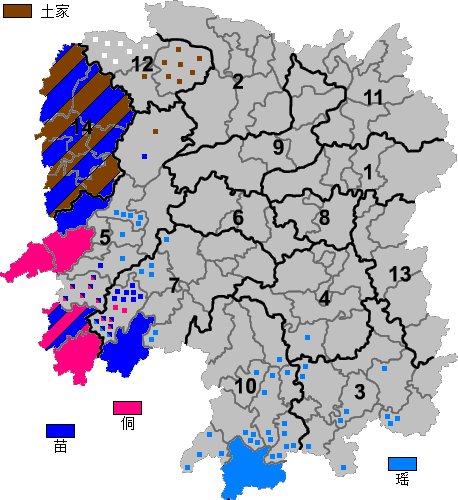 14 | 샹시 투자족 먀오족 자치주 | 湘西土家族苗族自治州 | Xiāngxī Tǔjiāzú Miáozú Zìzhìzhōu | 15462.3km2 | 2,547,833 | 지서우 시 |